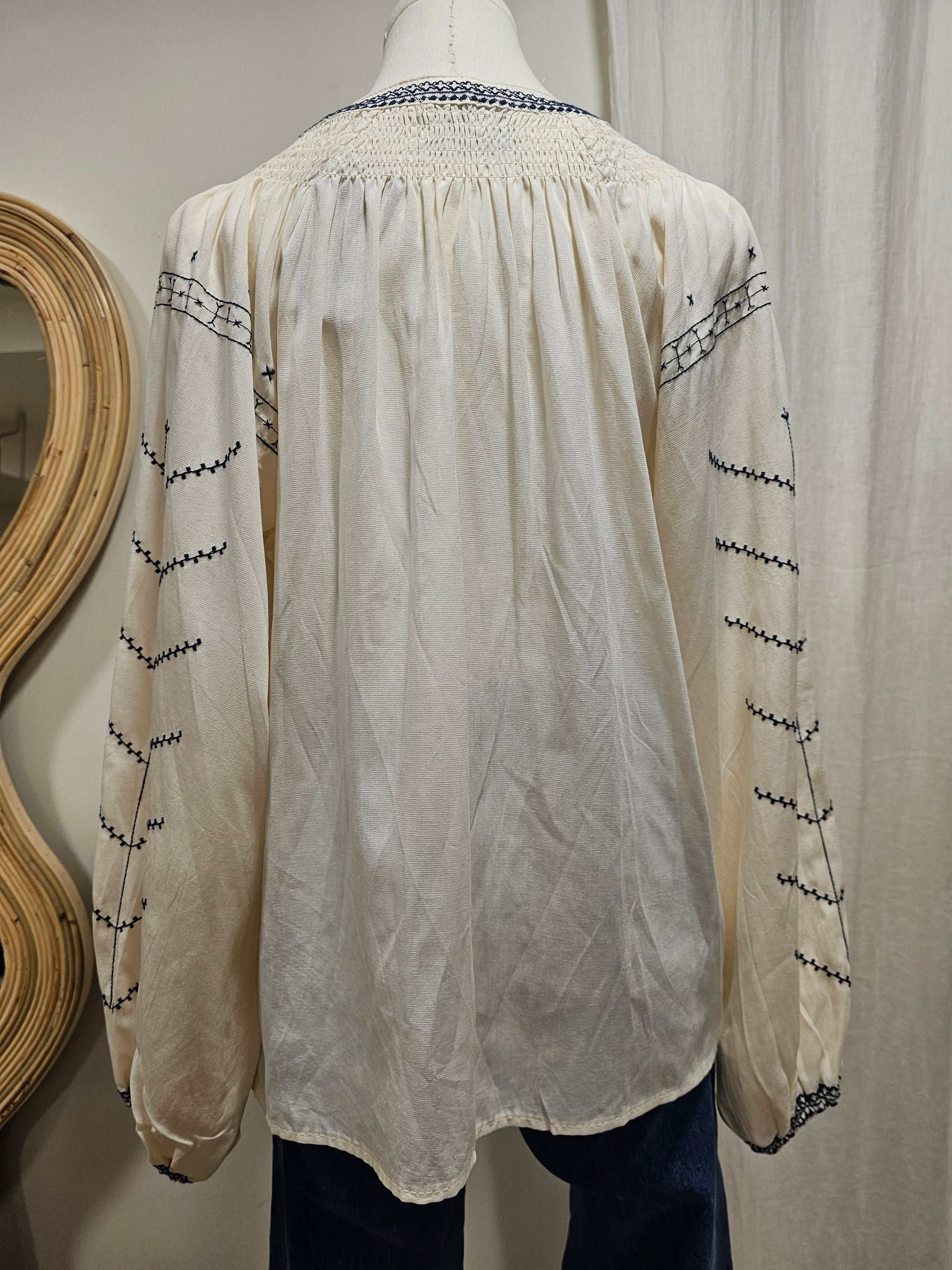 Blouse fluide en coton et viscose, coupe légèrement ample. Broderies contrastantes bleu marine sur le plastron et les manches, détails smockés aux épaules et manches longues légèrement bouffantes. Encolure tunisienne boutonnée.