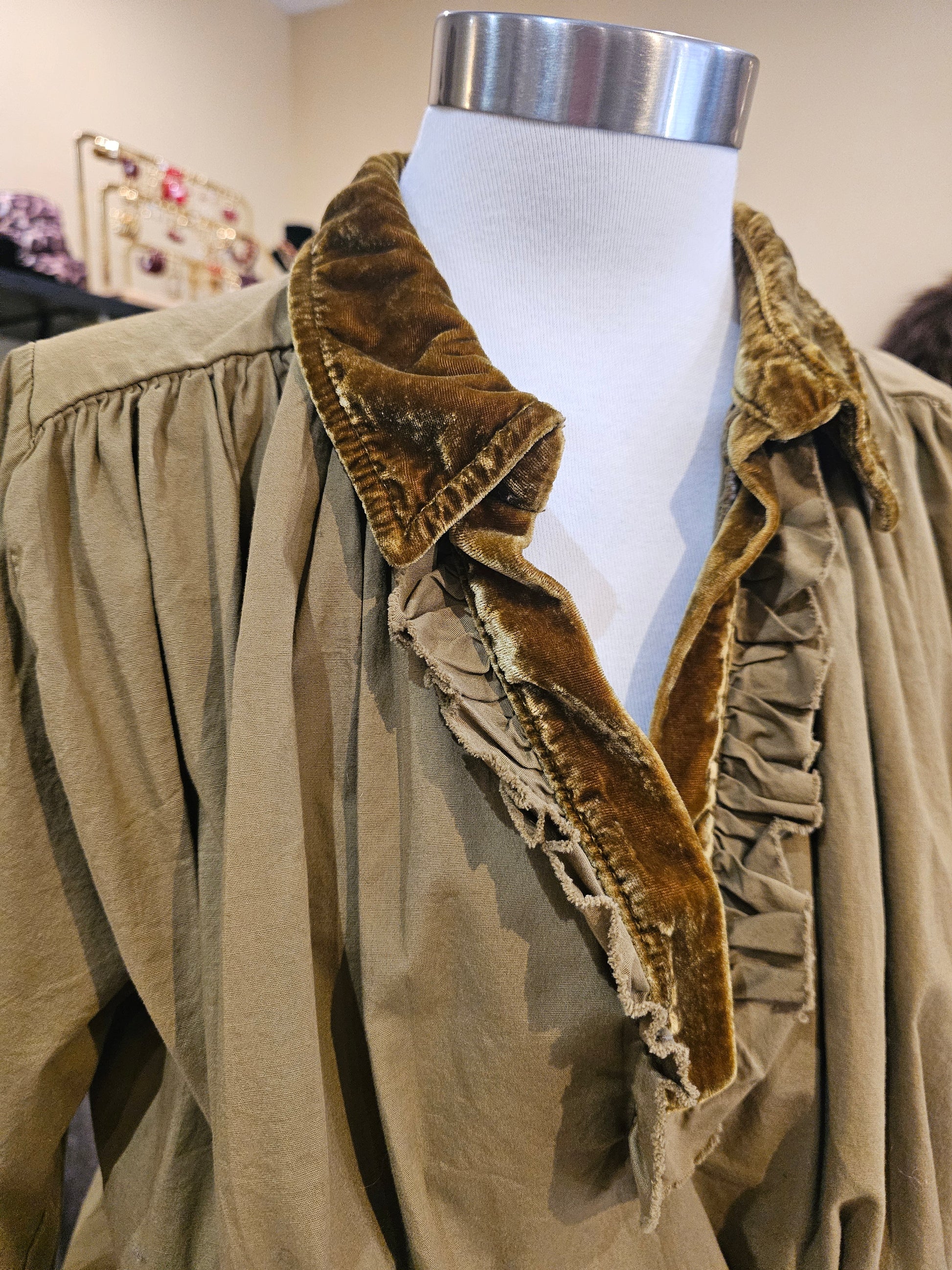 Blouse fluide bronze doré avec un col en velours mordoré et un joli détail plissé sur l’ouverture. Manches longues, volume ample, finitions velours sur les poignets. Une pièce douce, bohème et lumineuse, parfaite avec le pantalon coordonné. Taille unique (36–42).