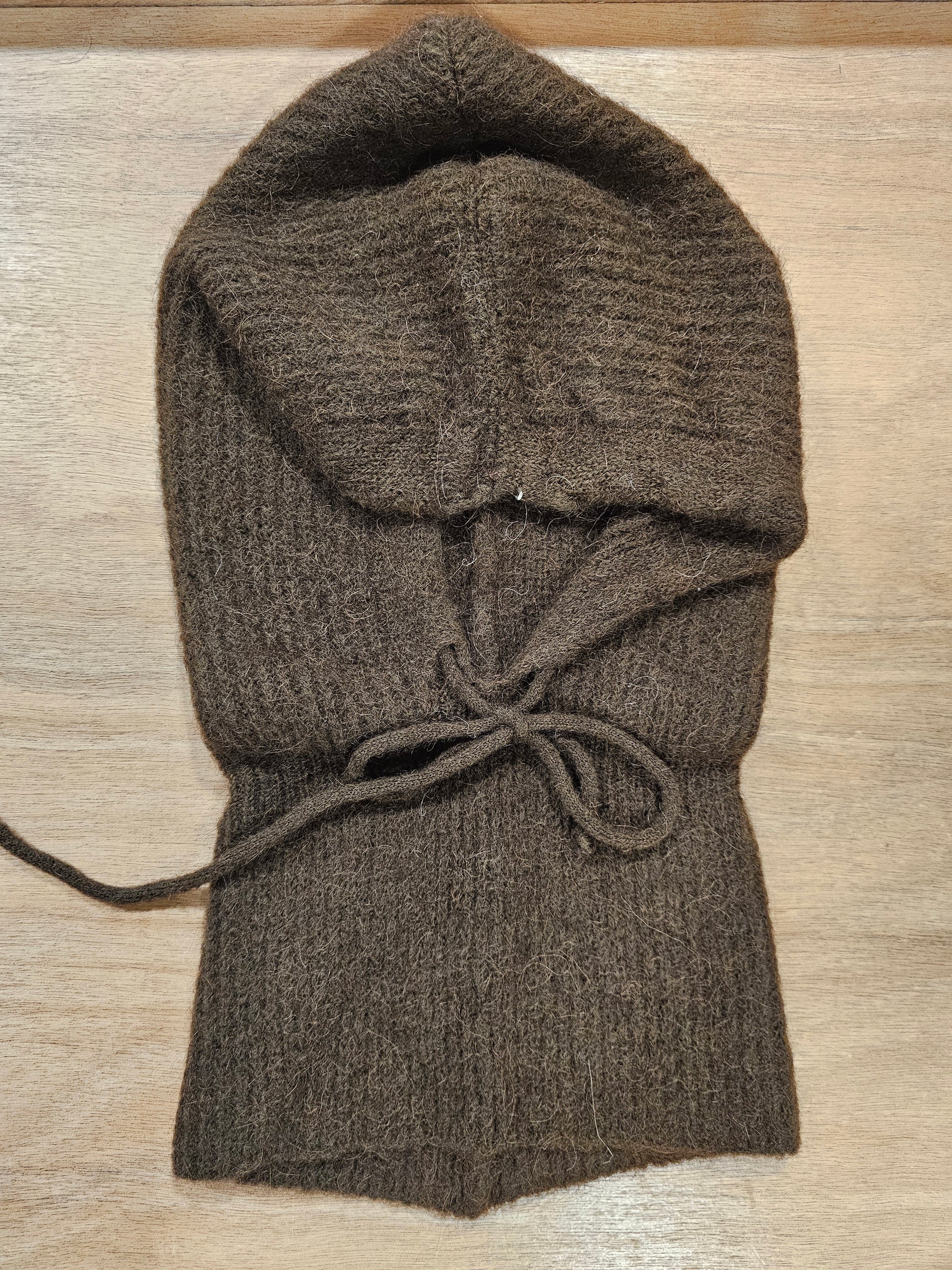 Une cagoule toute douce en marron chocolat, avec lien à nouer pour bien envelopper le visage et garder la chaleur.