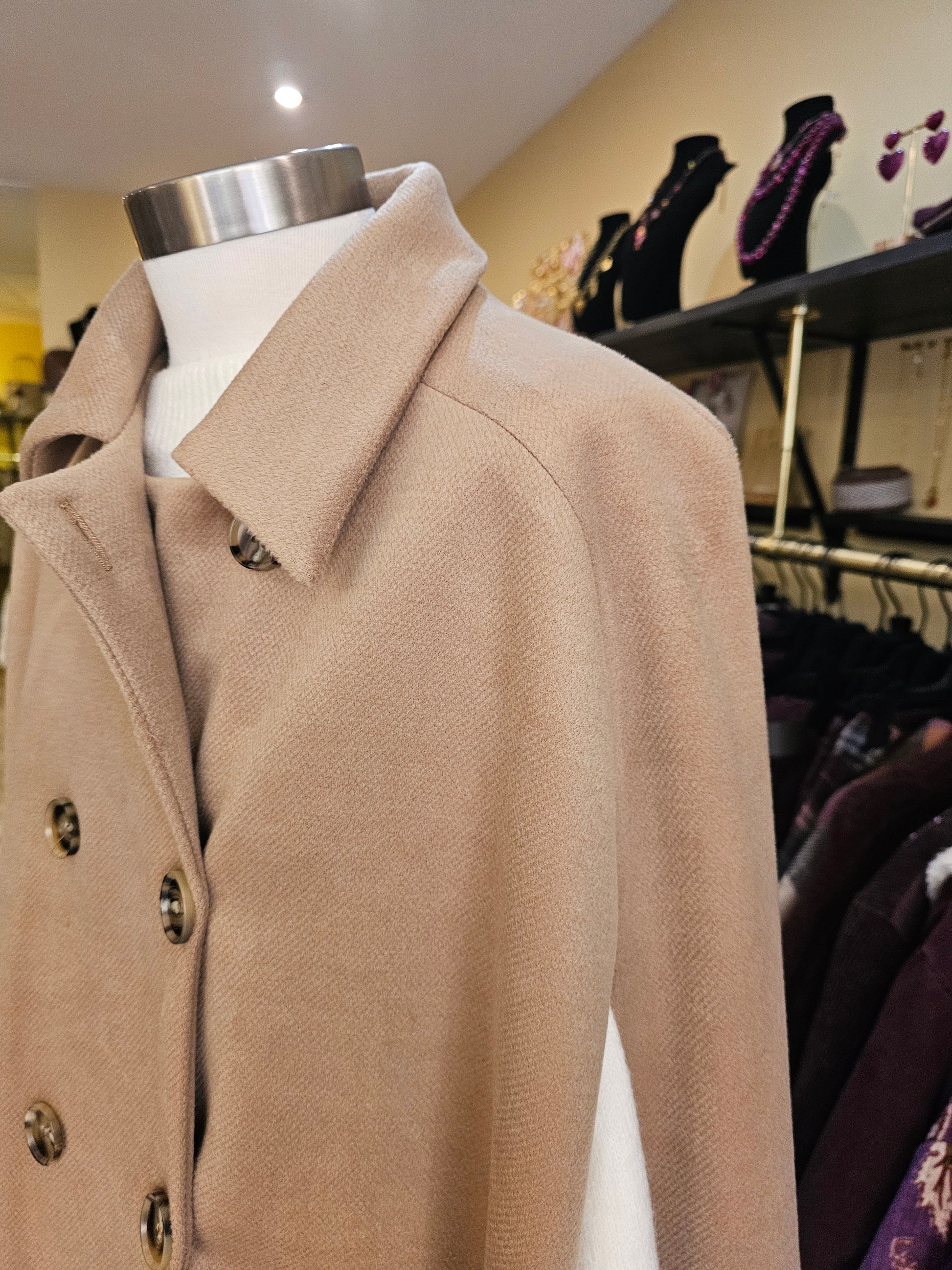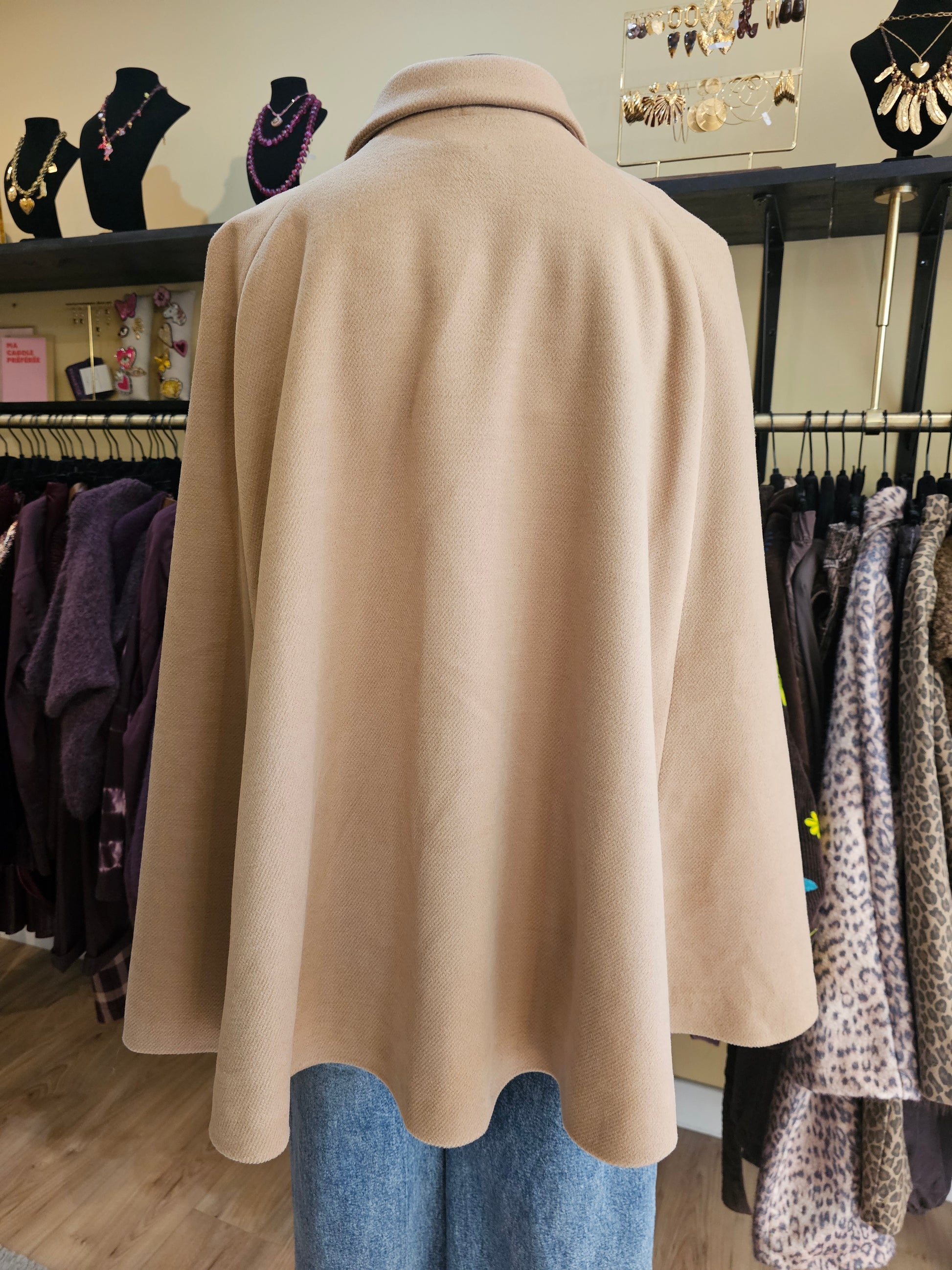 Cape fluide couleur camel, double boutonnage et col chemise.