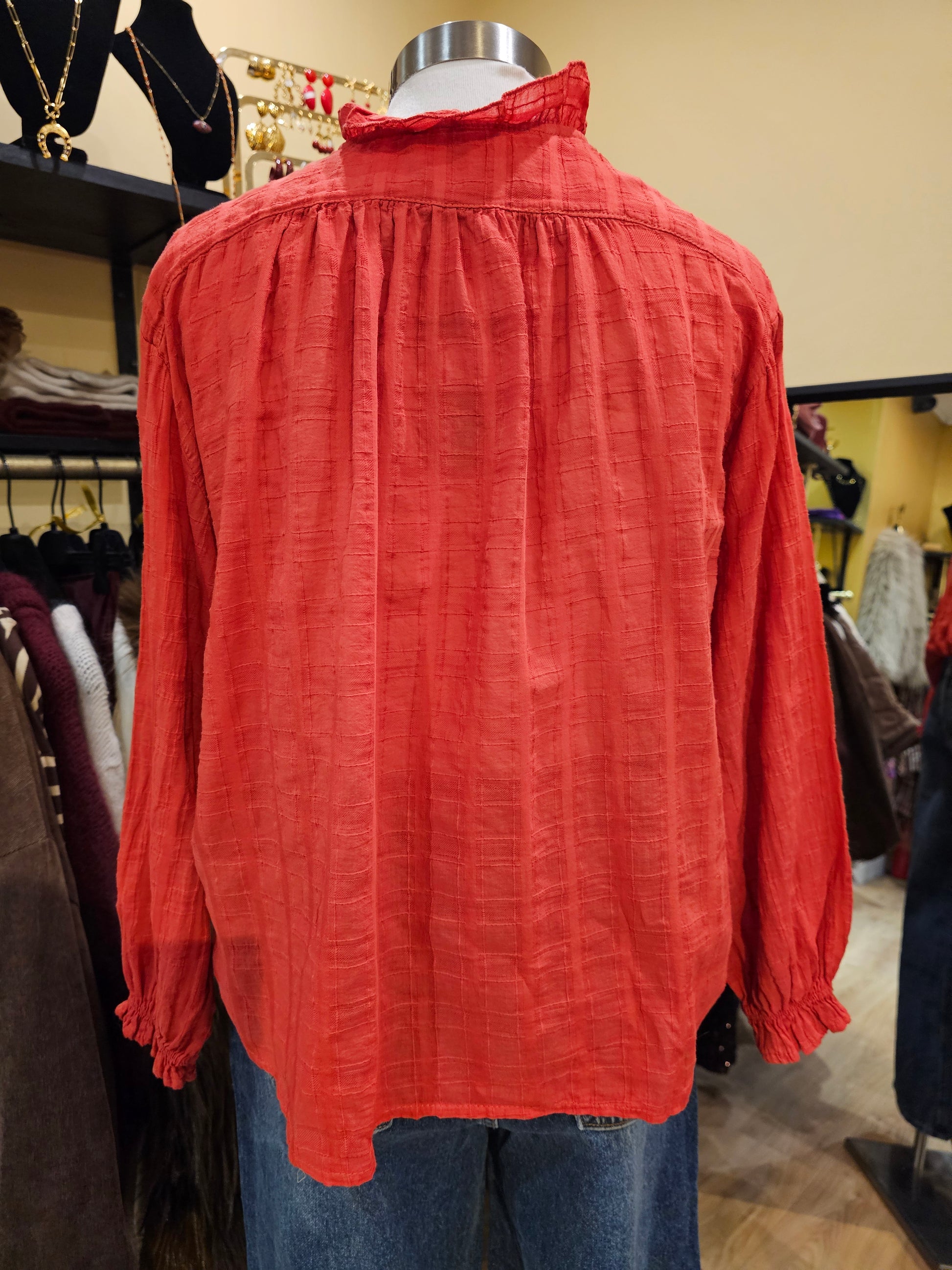 Blouse en coton texturé. Coupe droite. Col volanté. Fermeture boutonnée. Volants sur le devant. Manches longues avec poignets élastiqués.