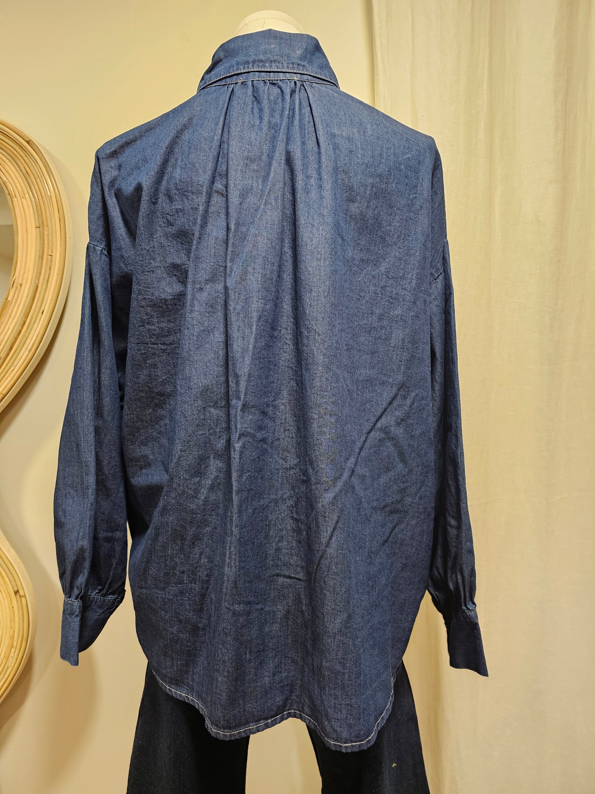 Une blouse en denim bleu, souple et légère, avec un col lavallière oversize pour un look chic sans effort. Facile à porter, facile à assortir. Johanna Paris