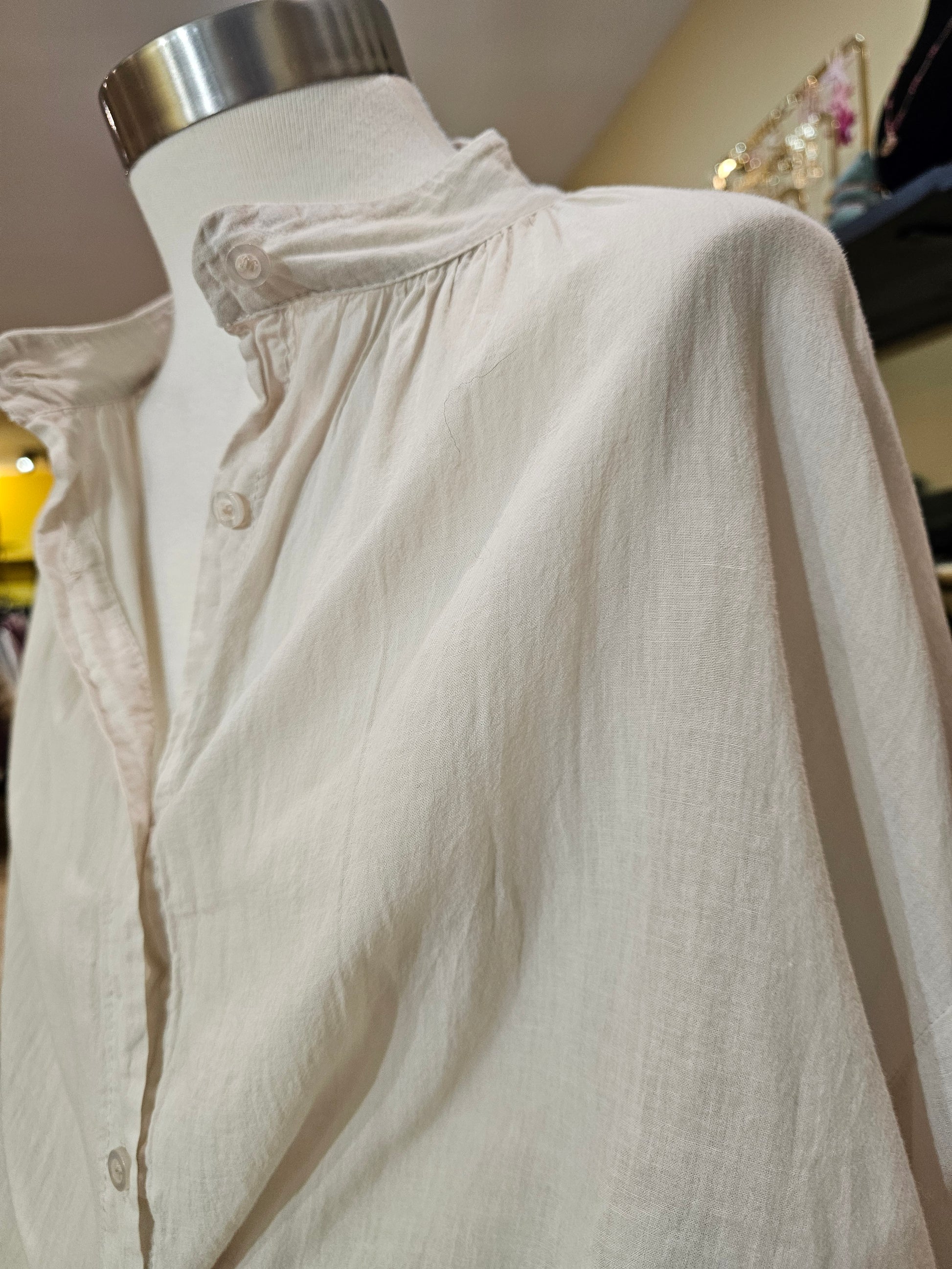 Blouse en voile de coton, manches longues, coupe ample, col officier avec patte de boutonnage devant. Fronces aux épaules et aux poignets.