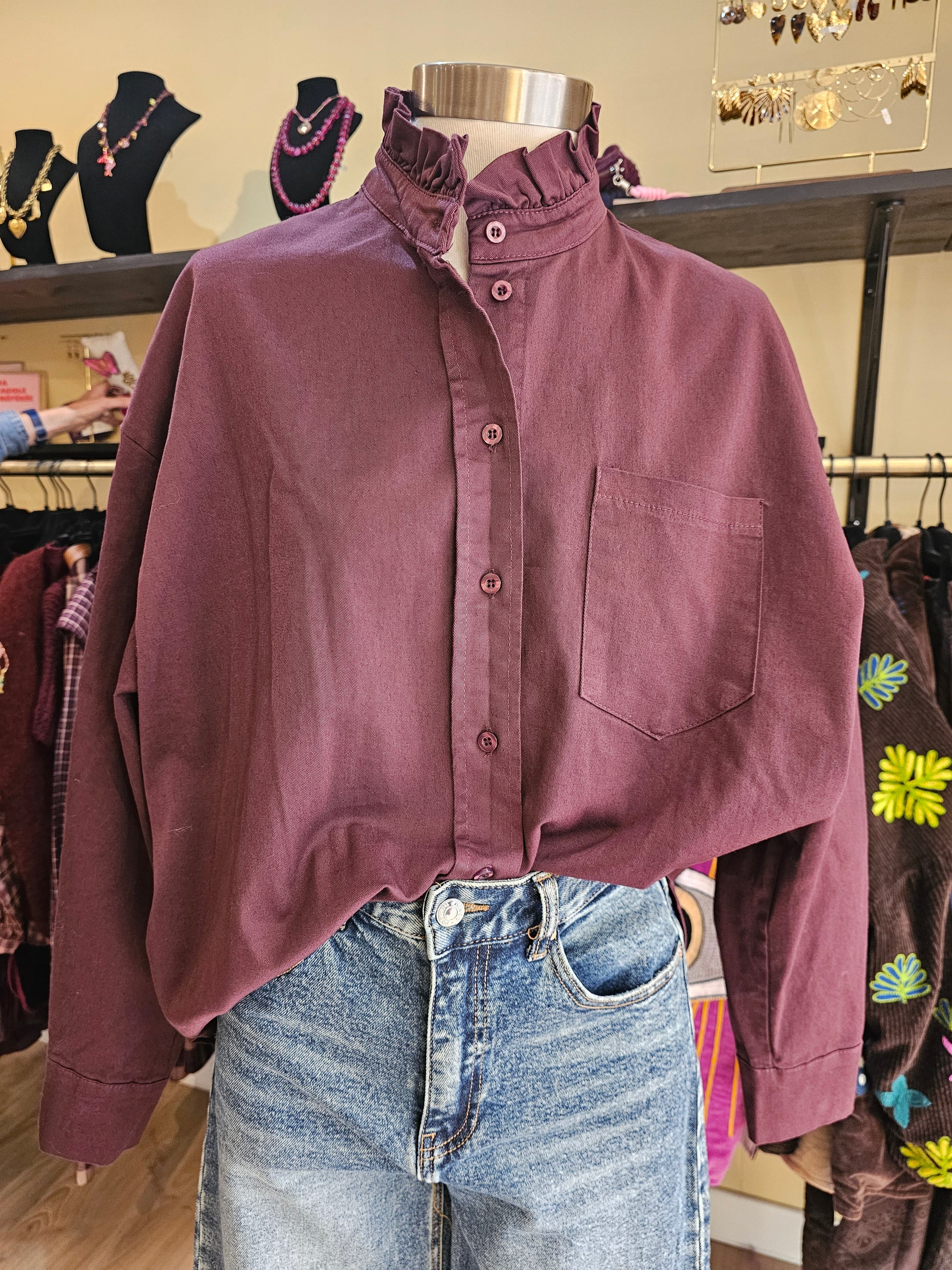 Chemise en coton prune avec col volanté et patte de boutonnage ton sur ton, poche poitrine, manches longues et coupe ample pour un tombé décontracté et féminin.