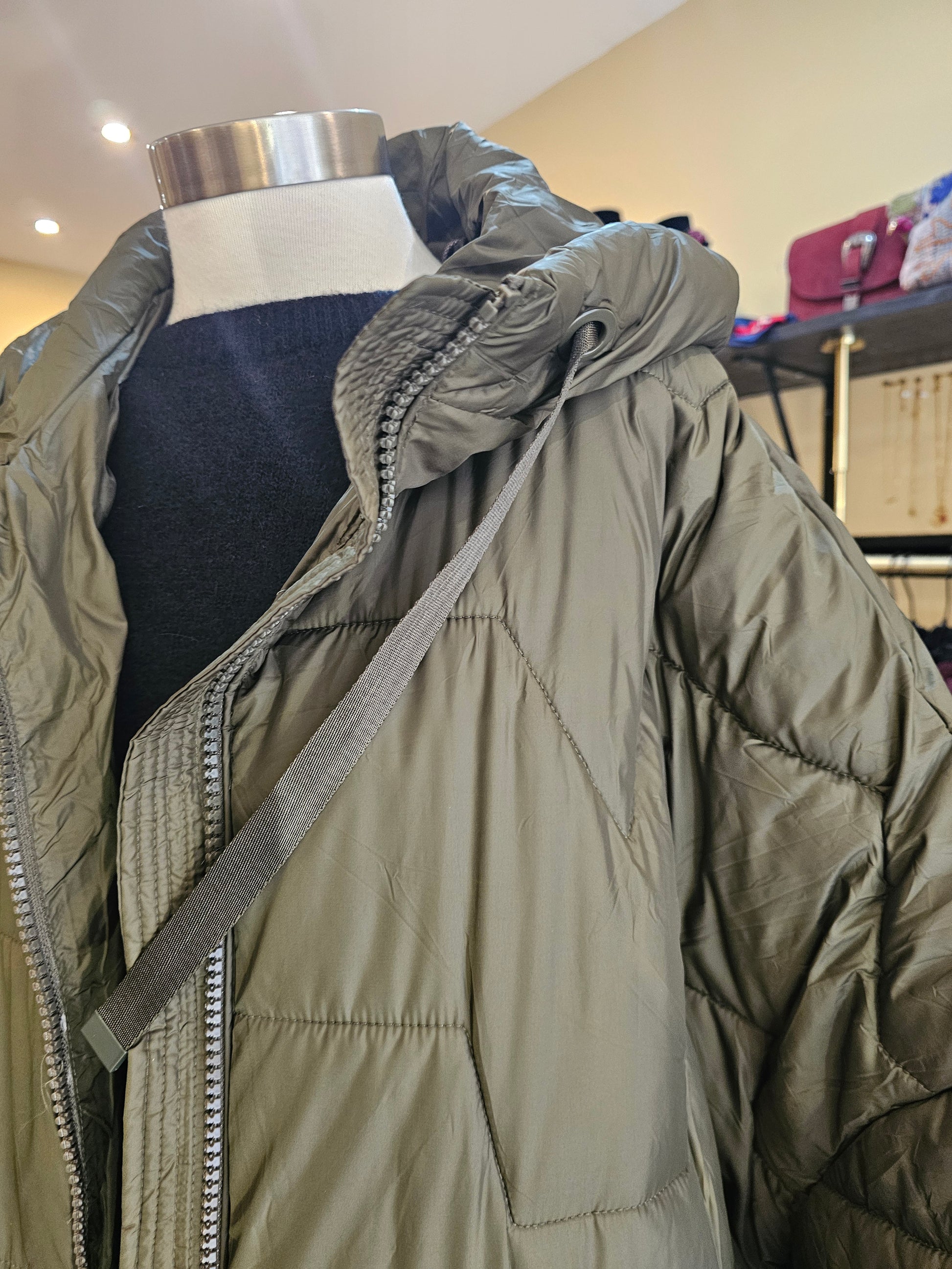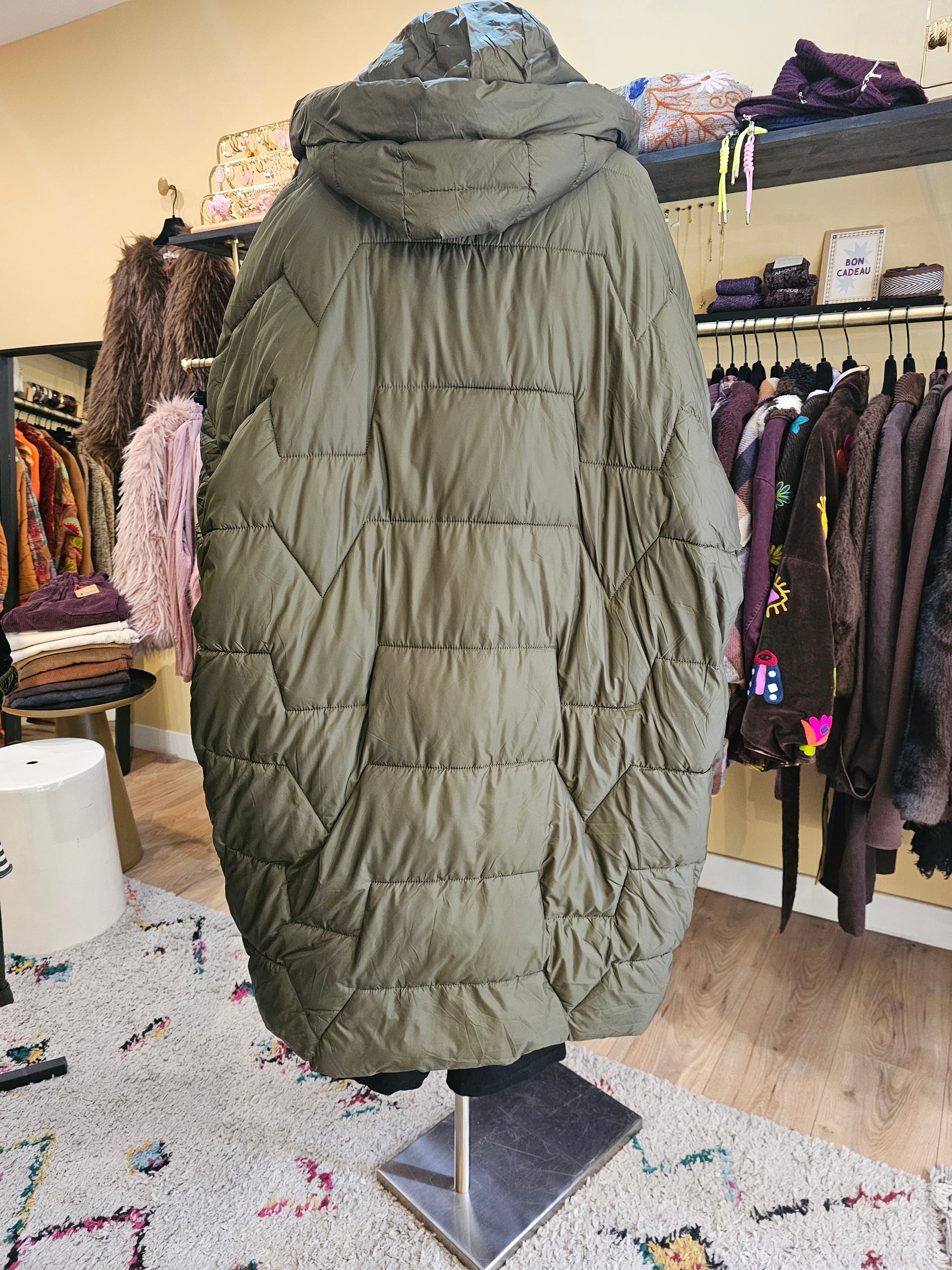 Doudoune longue kaki au volume oversize et matelassage géométrique.