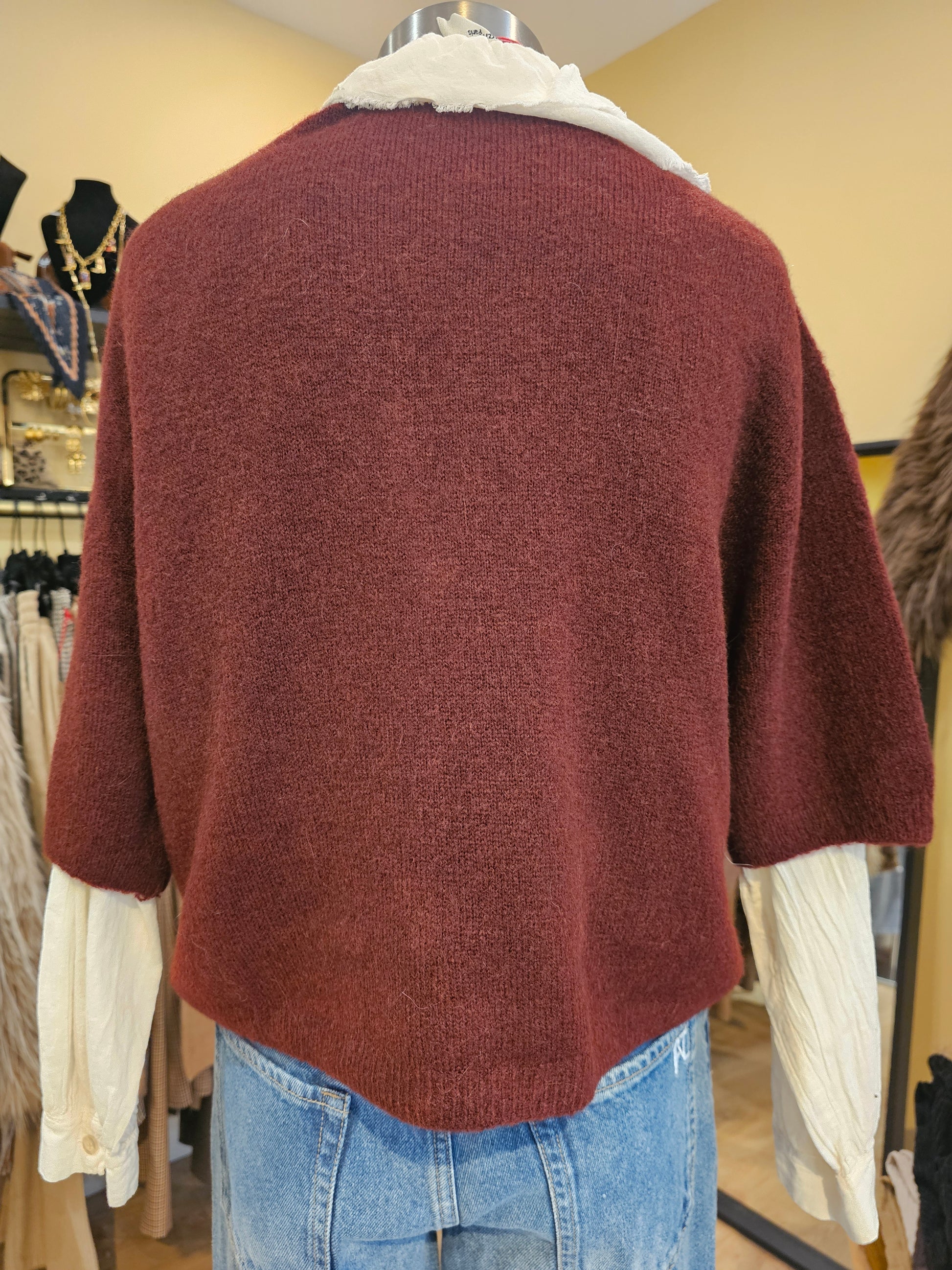 Petit gilet en maille douce couleur bordeaux, encolure V et boutons nacrés.