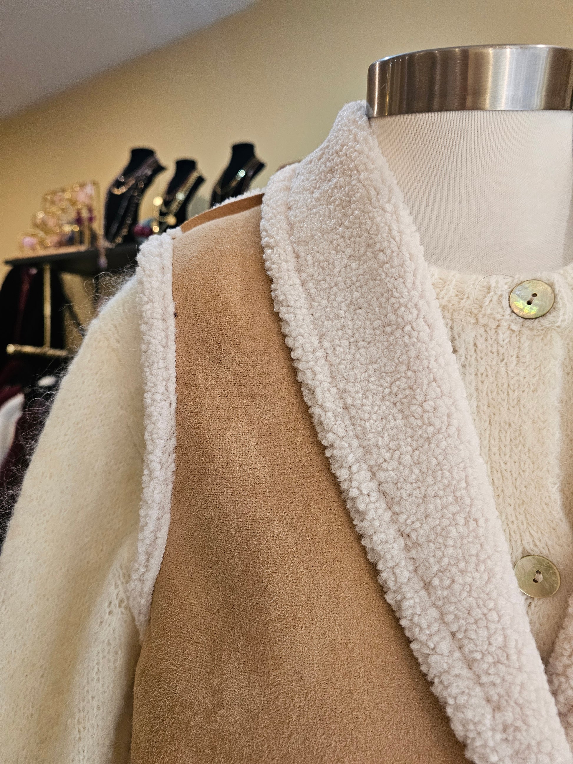 Un gilet sans manches doux et chaud signé Johanna Paris : extérieur suédé camel, intérieur effet mouton. Parfait pour superposer et donner du relief à une silhouette.