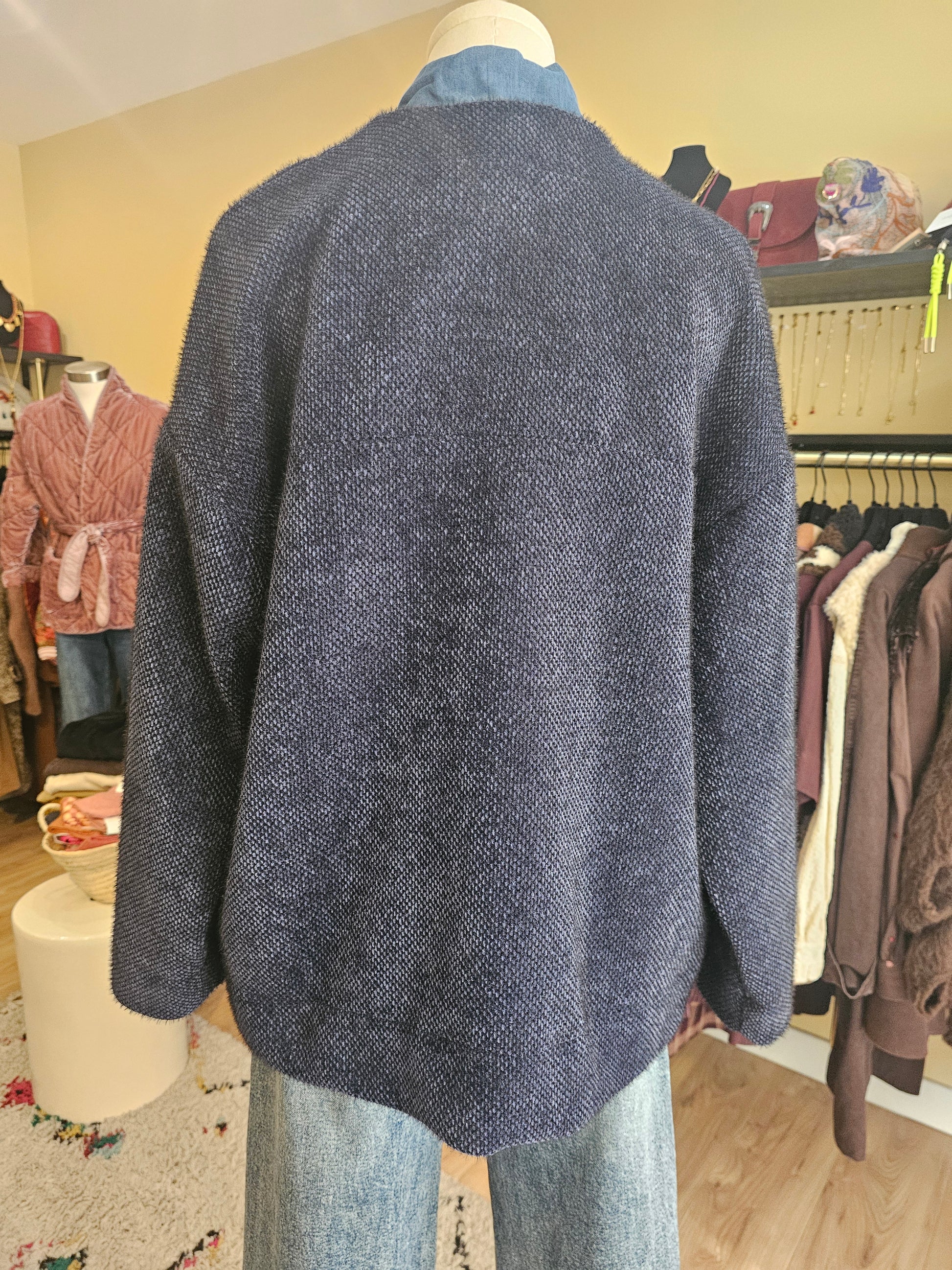 Gilet en maille bleu nuit, coupe droite, col V, deux grandes poches plaquées et beaux boutons ton sur ton. Matière douce et légèrement texturée.