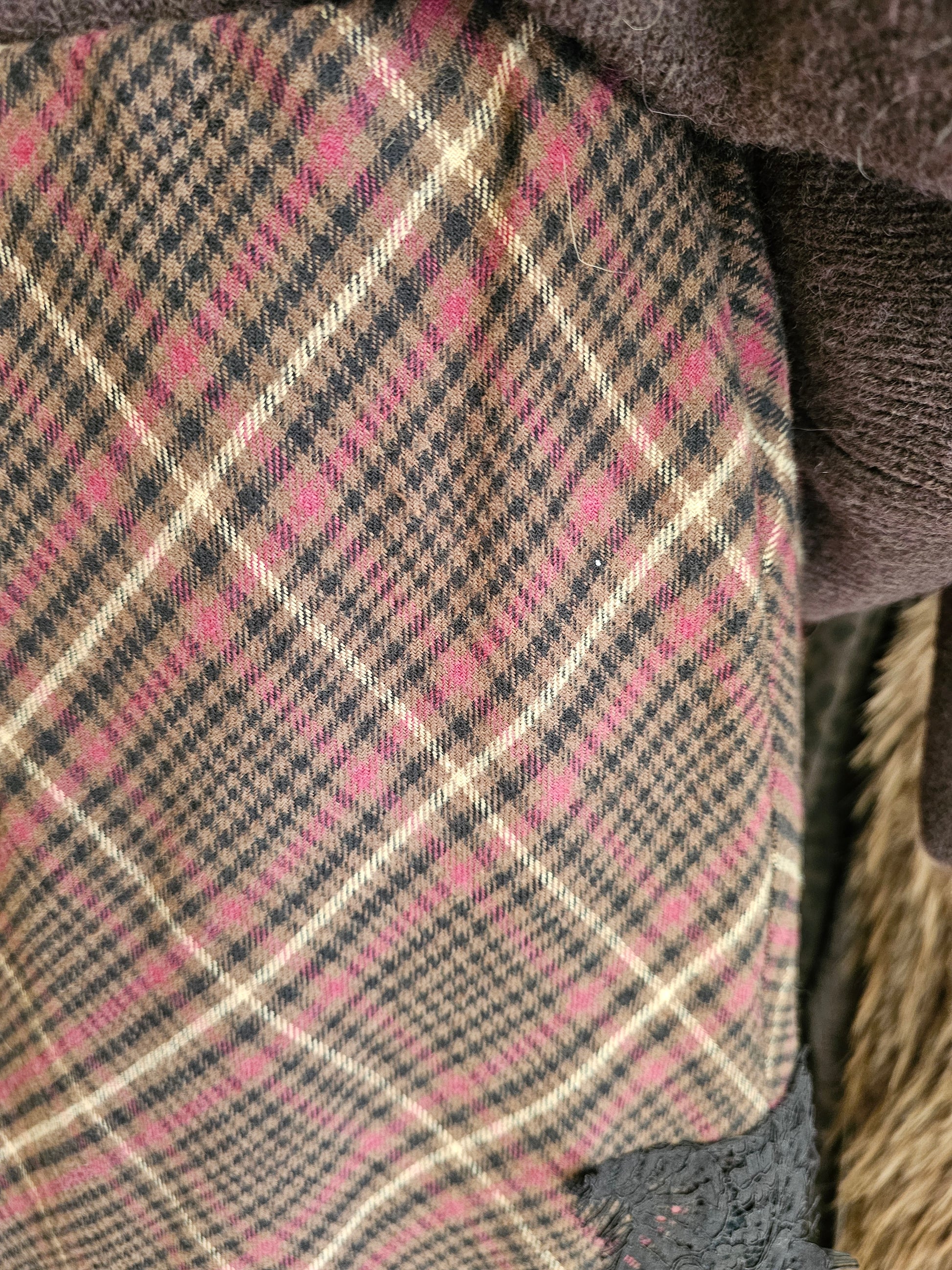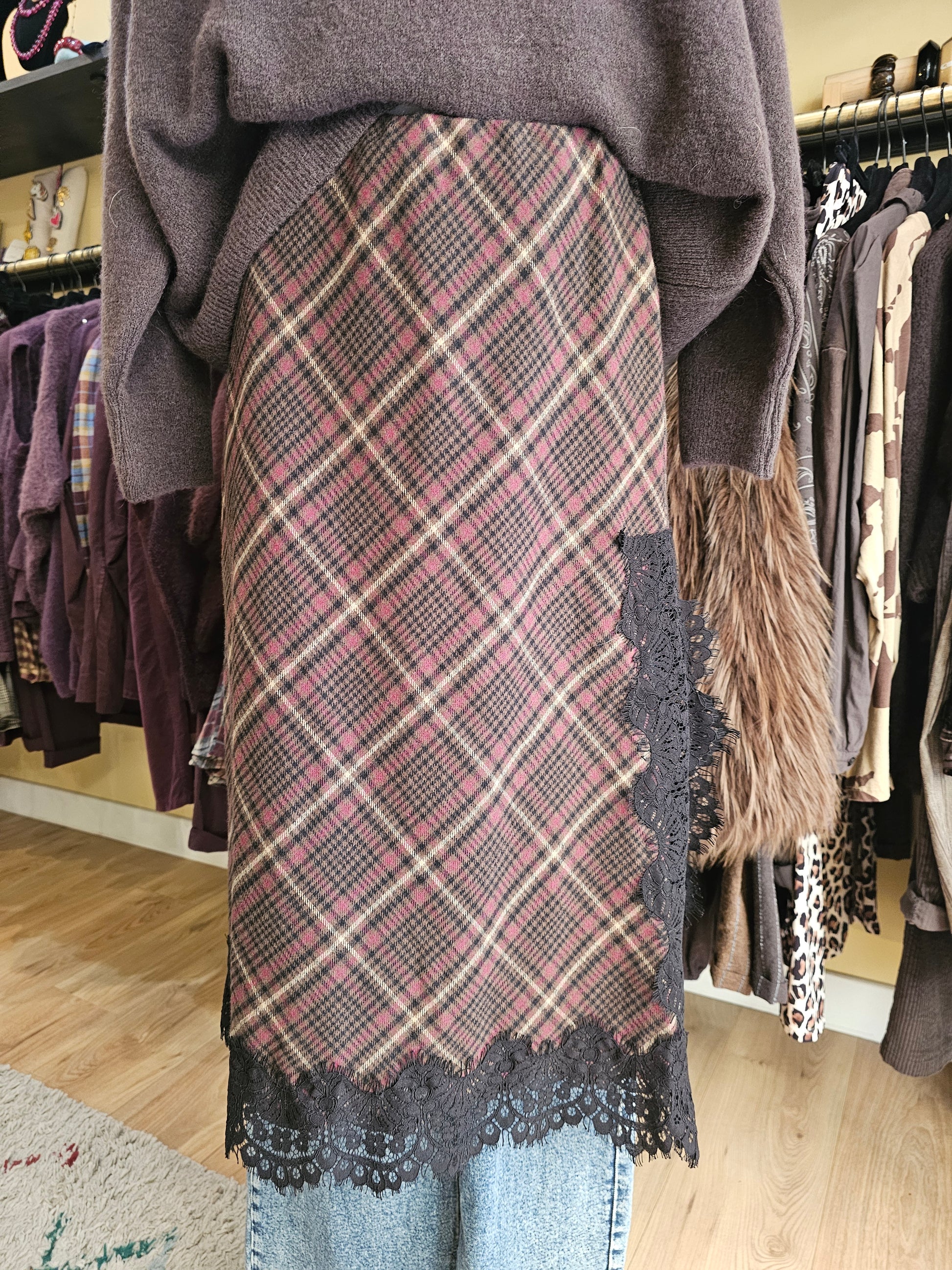 Jupe droite à carreaux dans les tons bruns et bordeaux, bordée de dentelle noire sur le bas et les côtés.