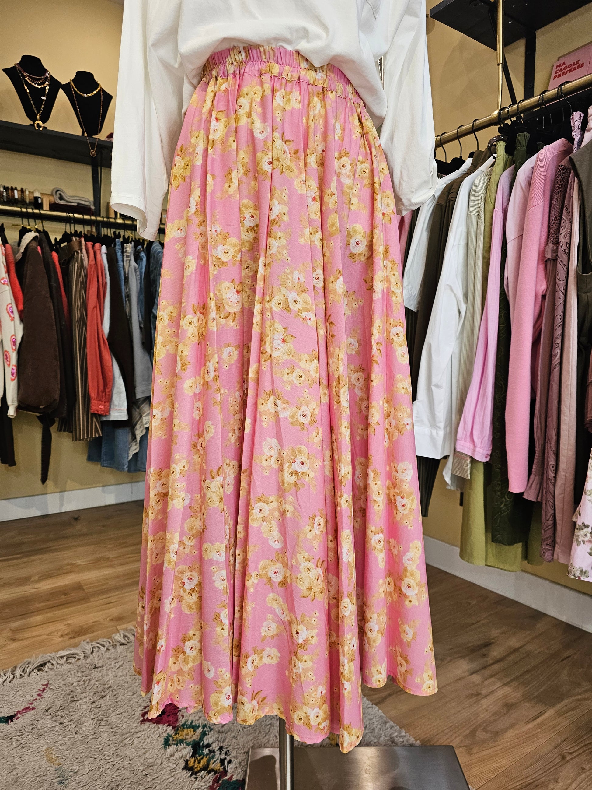 Jupe longue à taille élastiquée, avec un joli volume et un tombé léger. Imprimé fleurs jaune et écru sur fond rose, facile à porter avec un tee-shirt ou un pull fin.