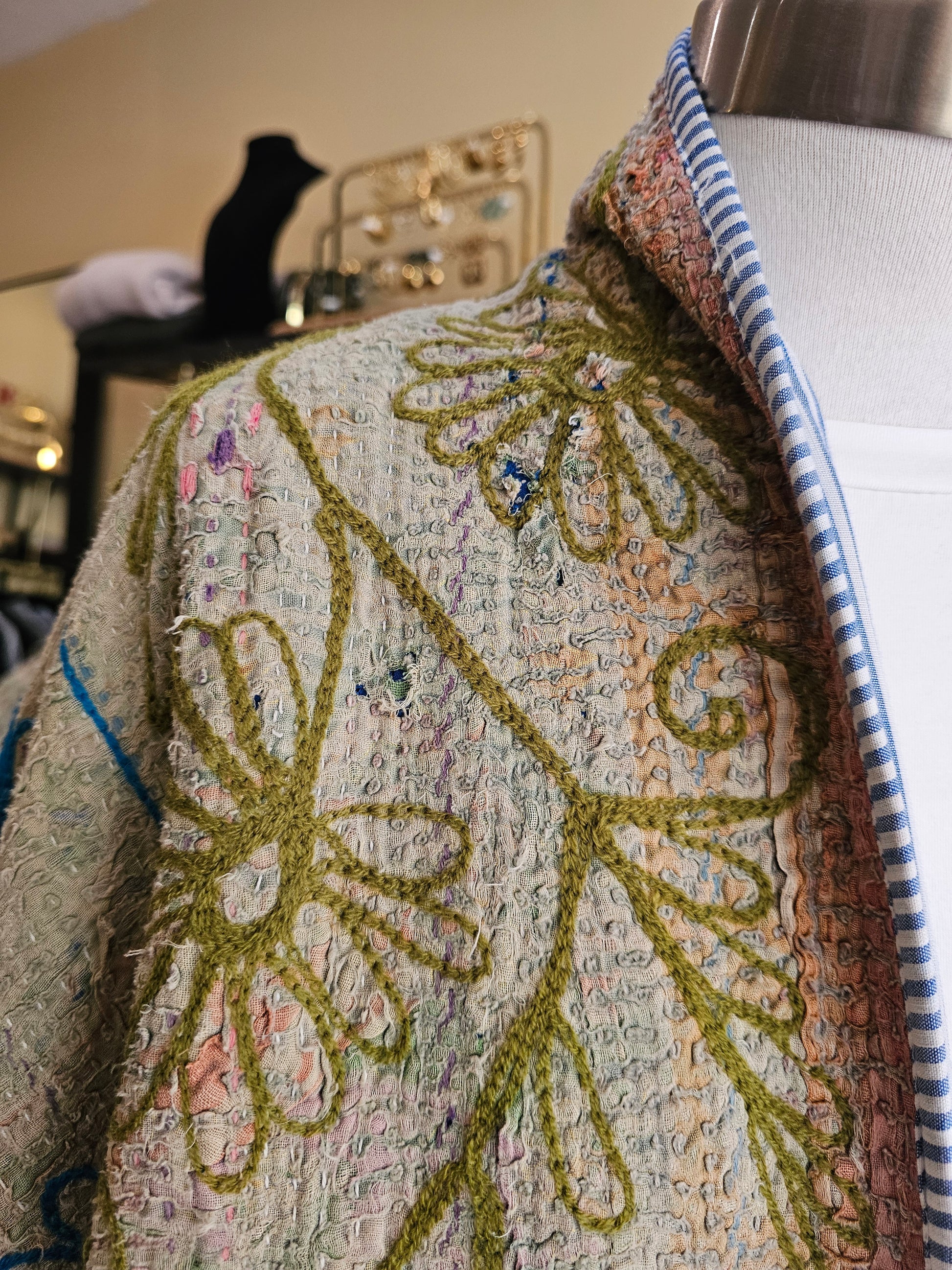 Veste ample esprit kimono en textile khanta ancien, broderies florales multicolores et finitions rayées bleu et blanc.