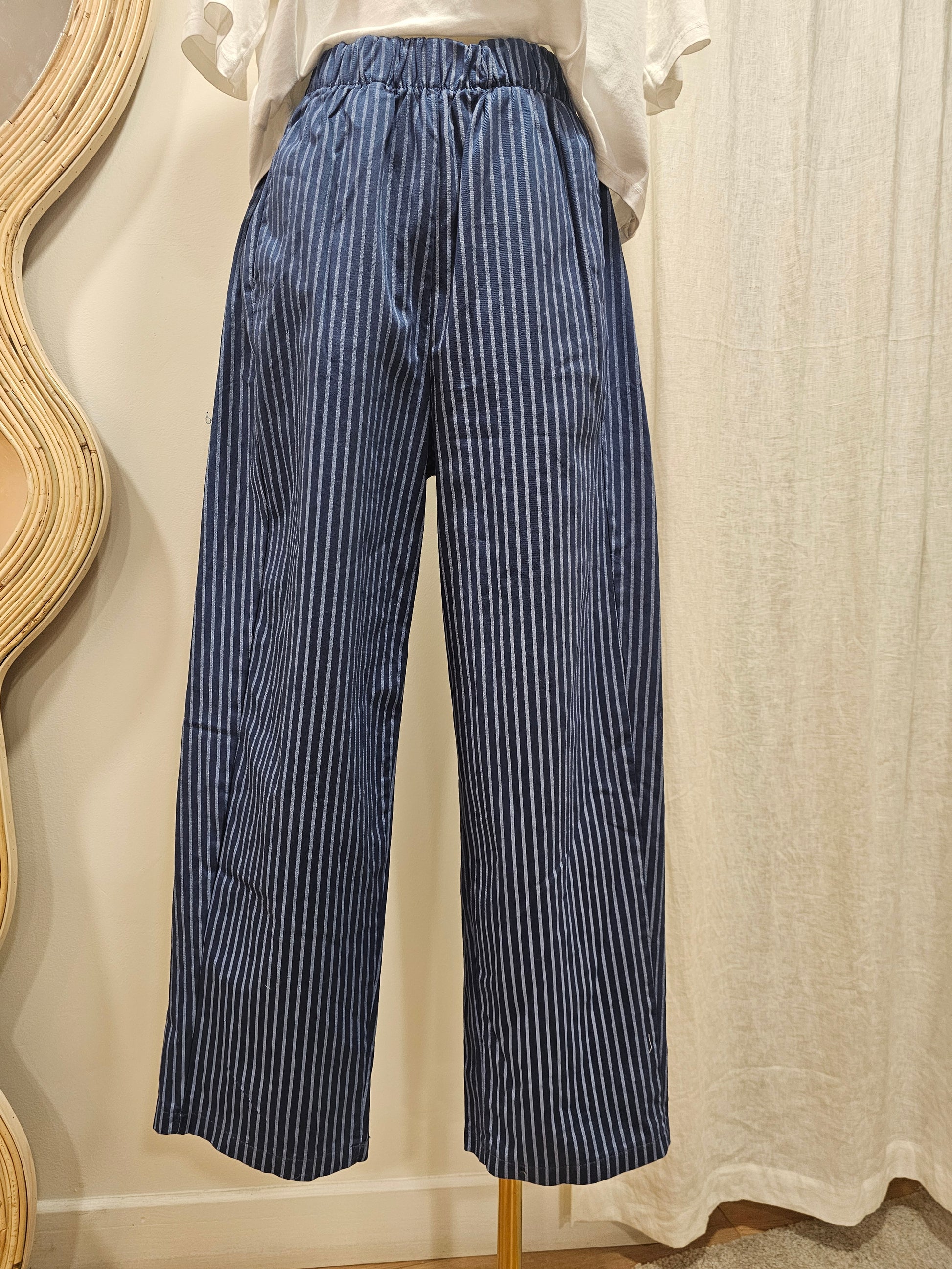Pantalon fluide en coton mélangé, coupe droite légèrement ample. Taille élastiquée, poches côtés et rayures fines écrues sur fond bleu denim.