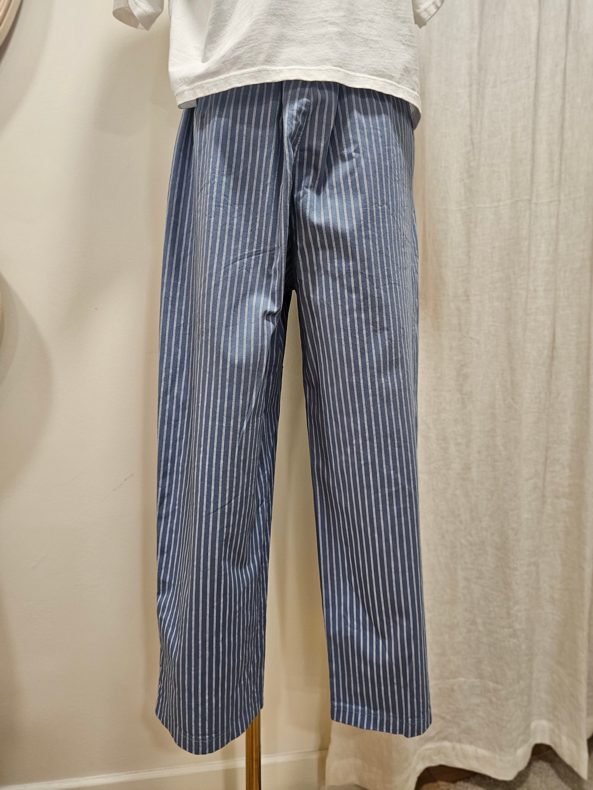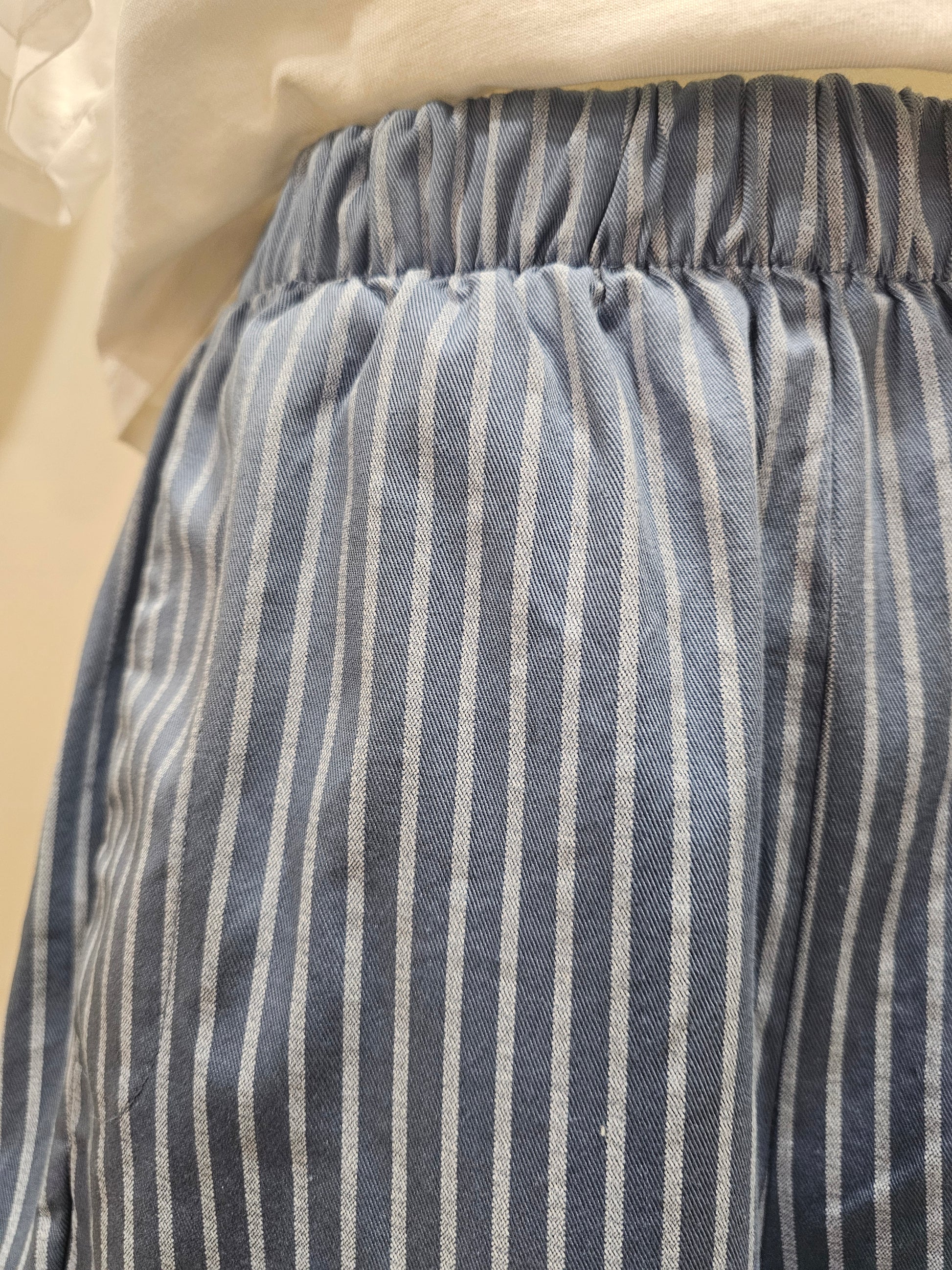 Pantalon fluide en coton mélangé, coupe droite légèrement ample. Taille élastiquée, poches côtés et rayures fines écrues sur fond bleu denim.
