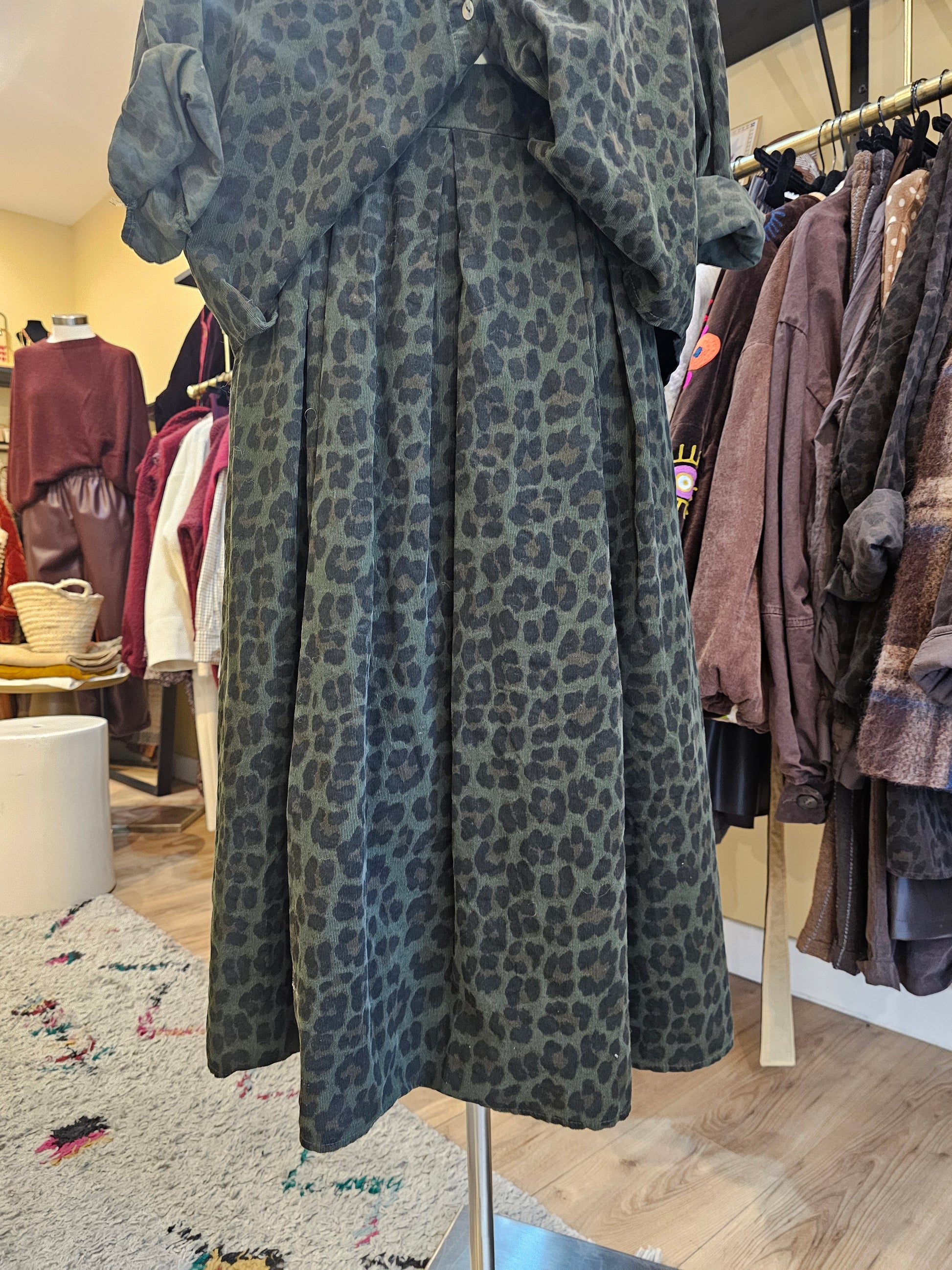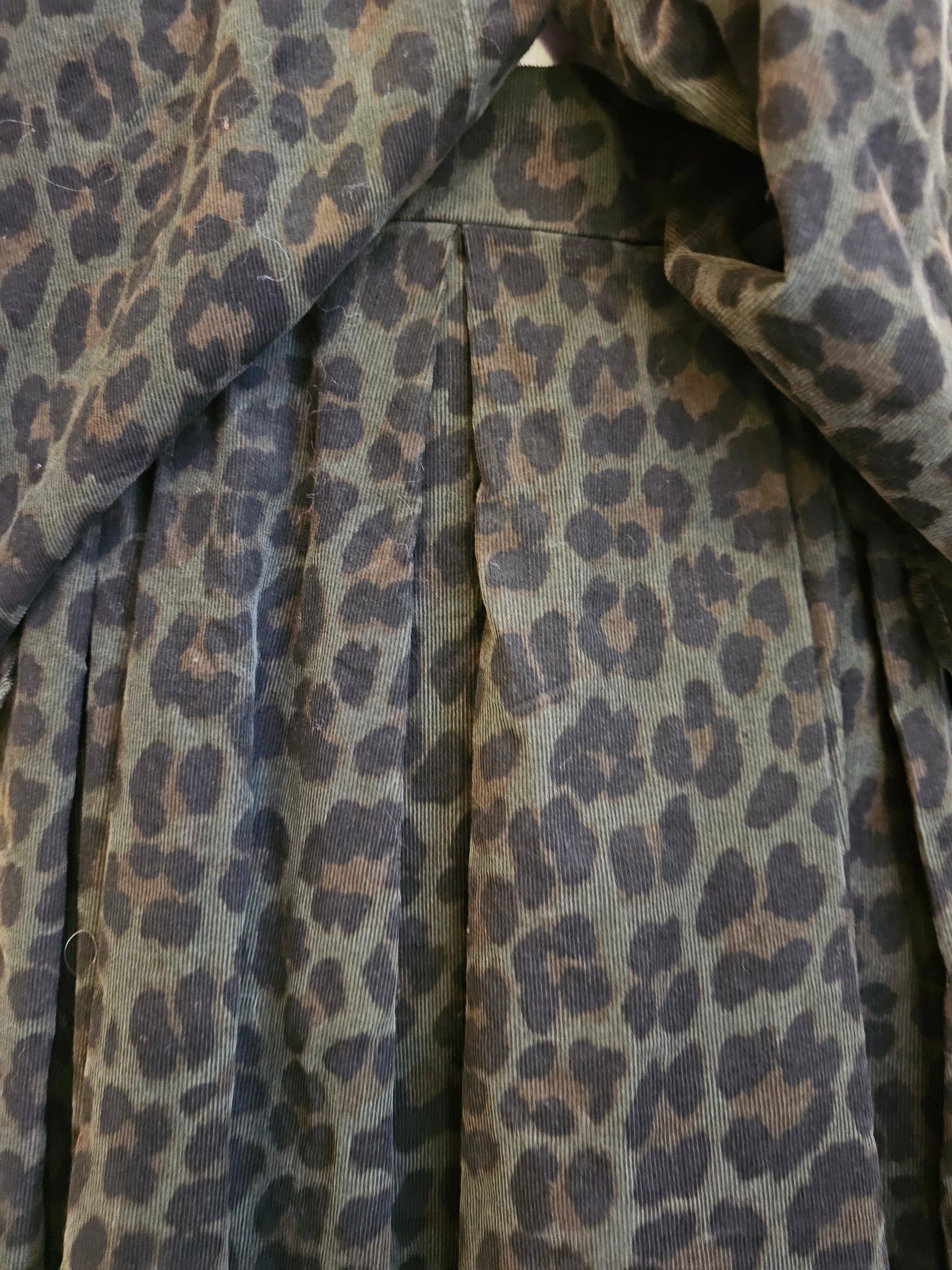 Jupe longue fluide en velours côtelé léger, imprimée léopard kaki et brun. Taille confortable, jolie ampleur, tombé souple : la pièce facile à porter avec un pull oversize ou la chemise coordonnée pour un ensemble.
