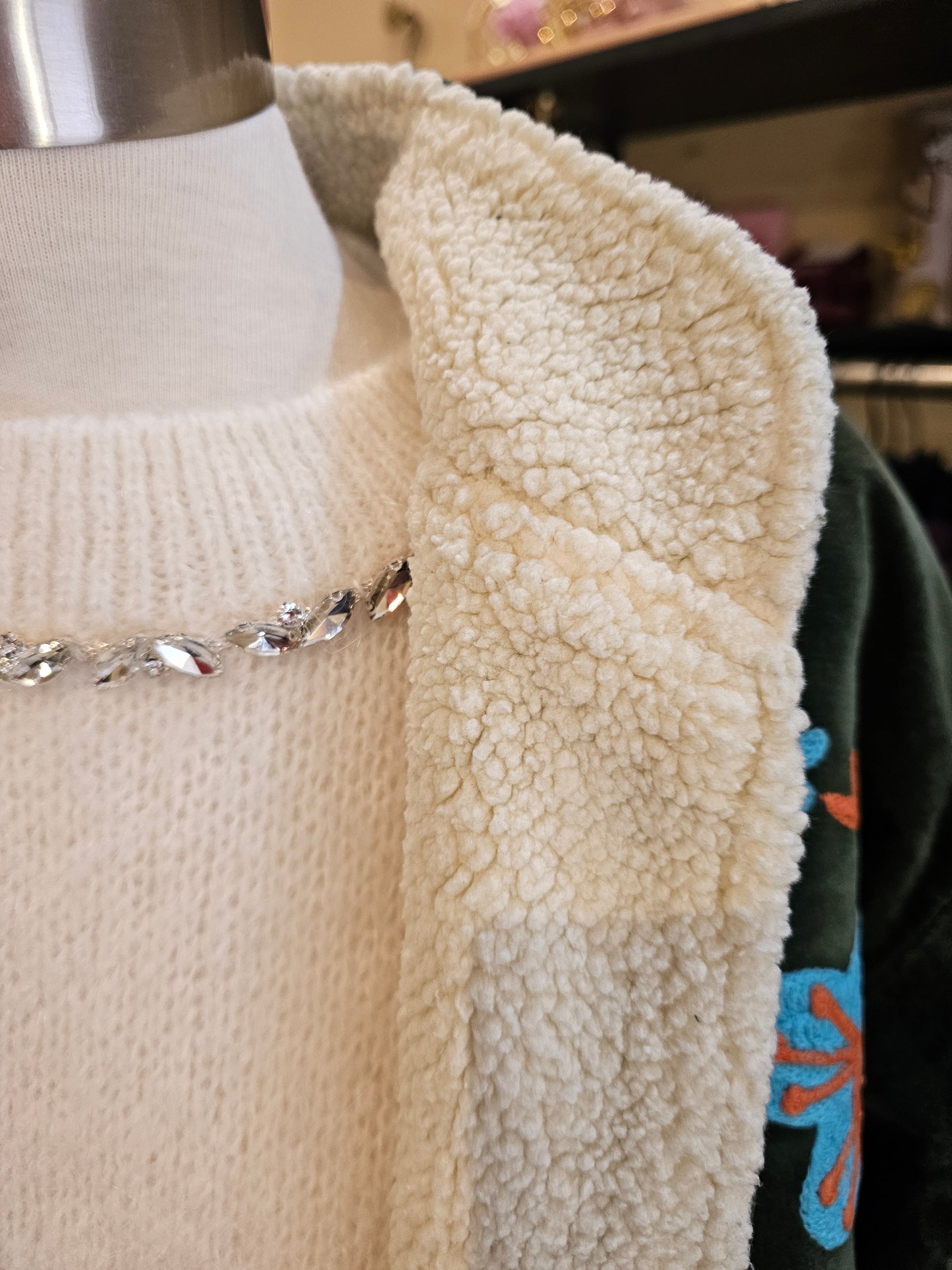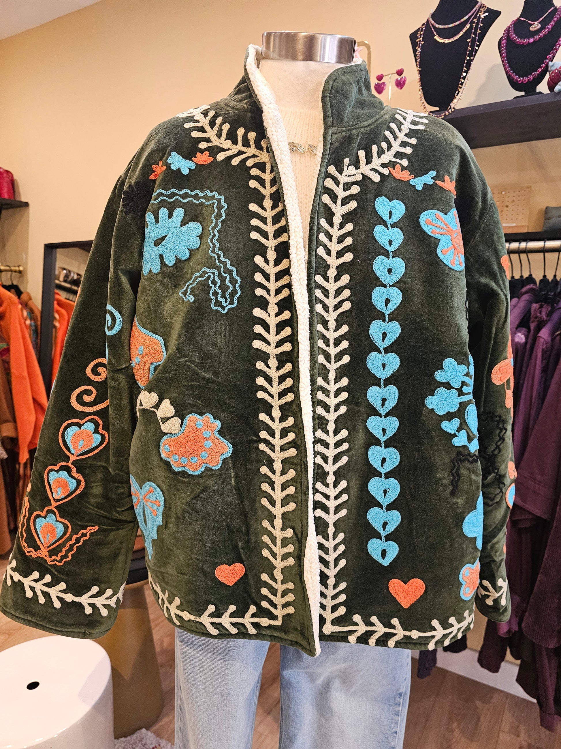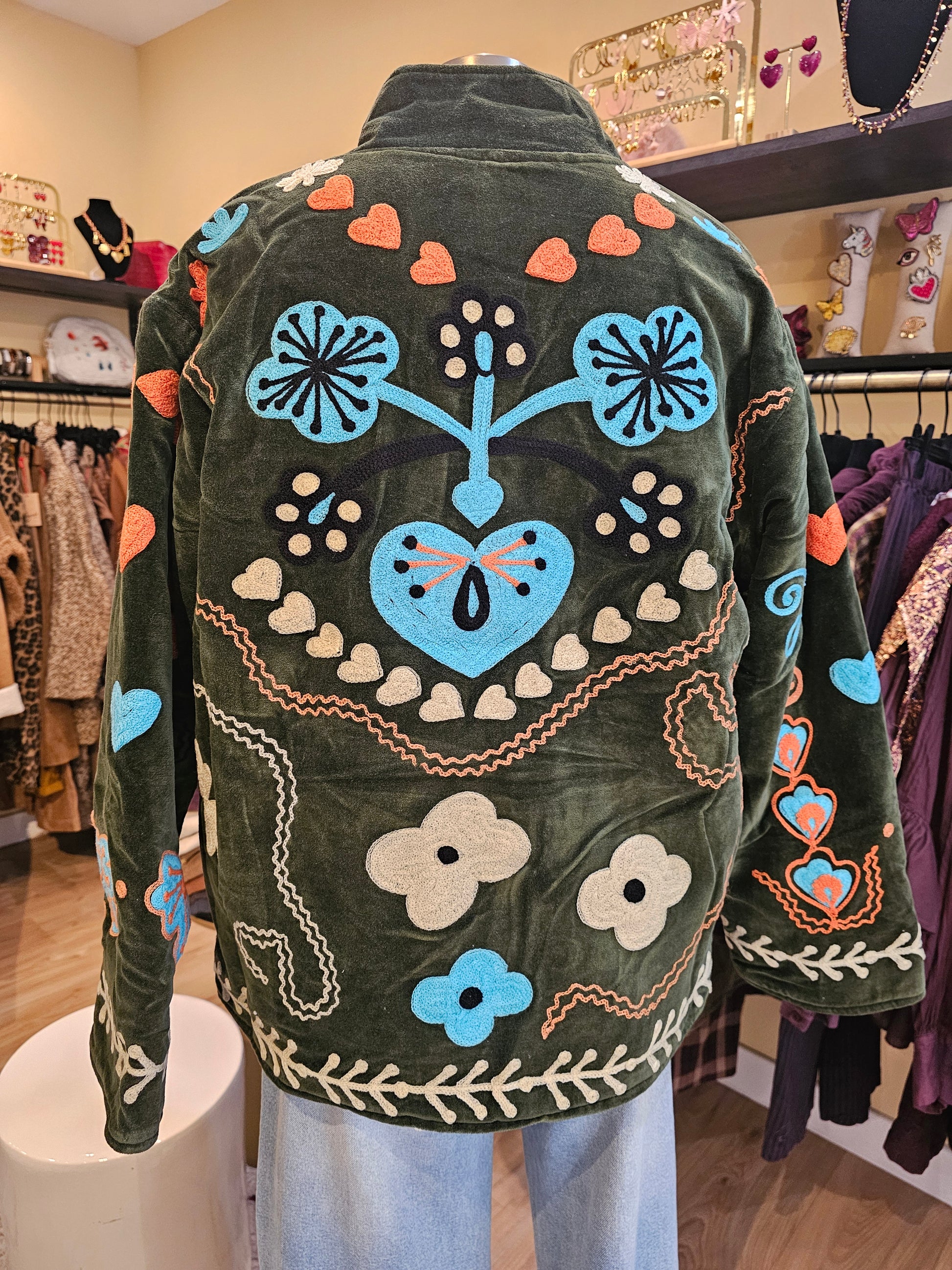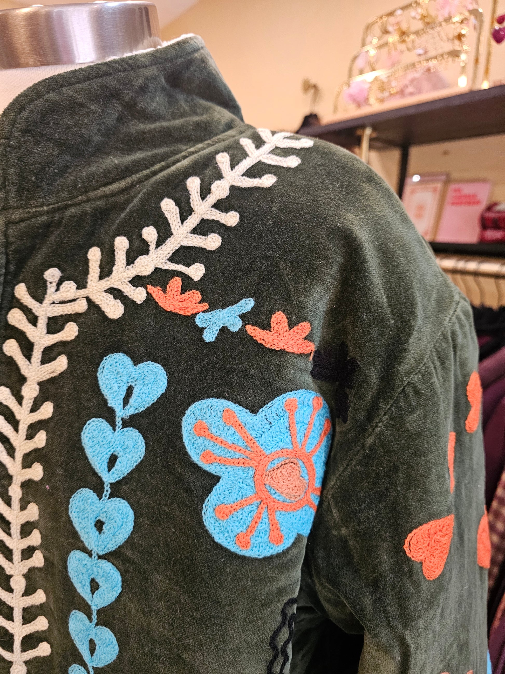 Veste en velours vert forêt brodée de motifs floraux et cœurs dans des tons bleu ciel, écru et brique.