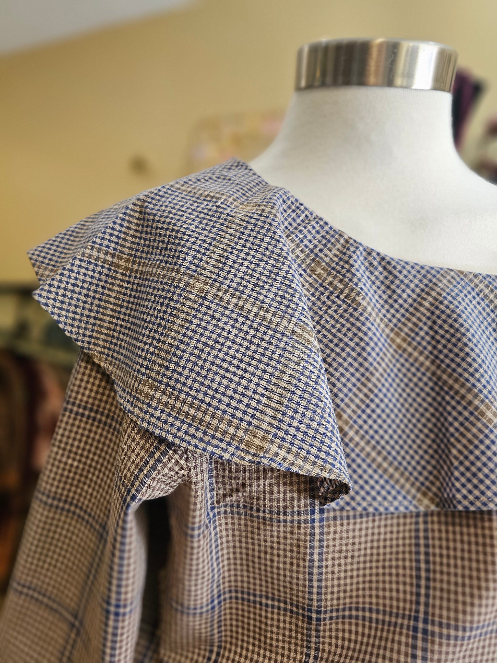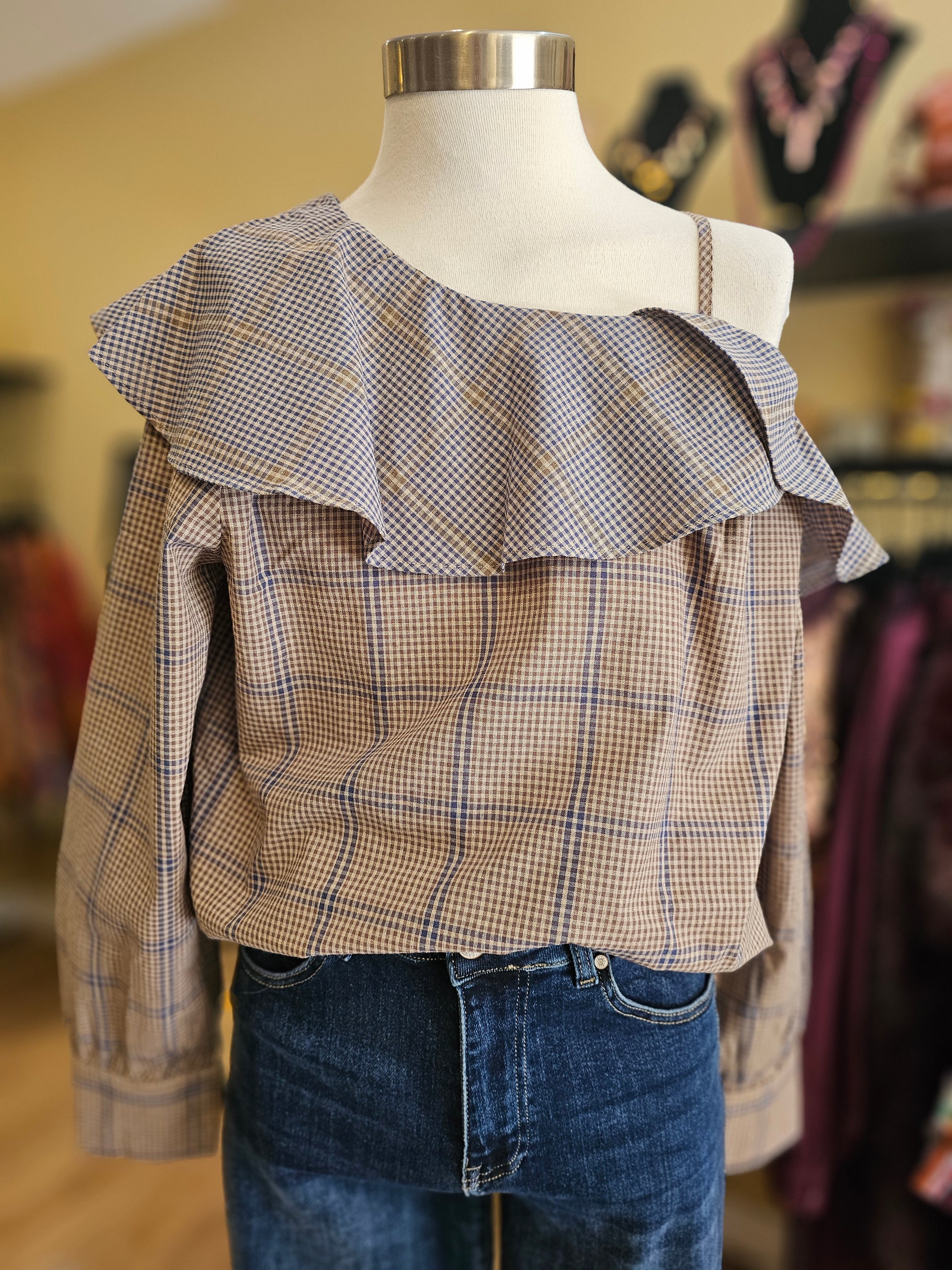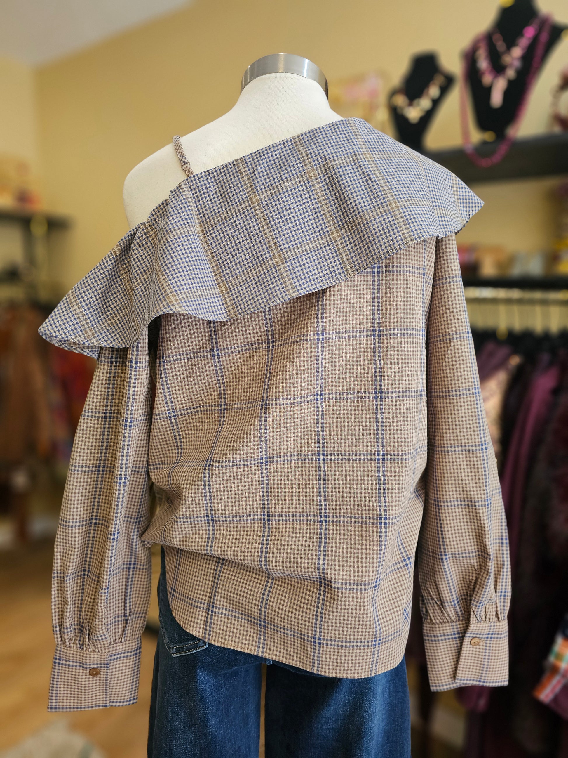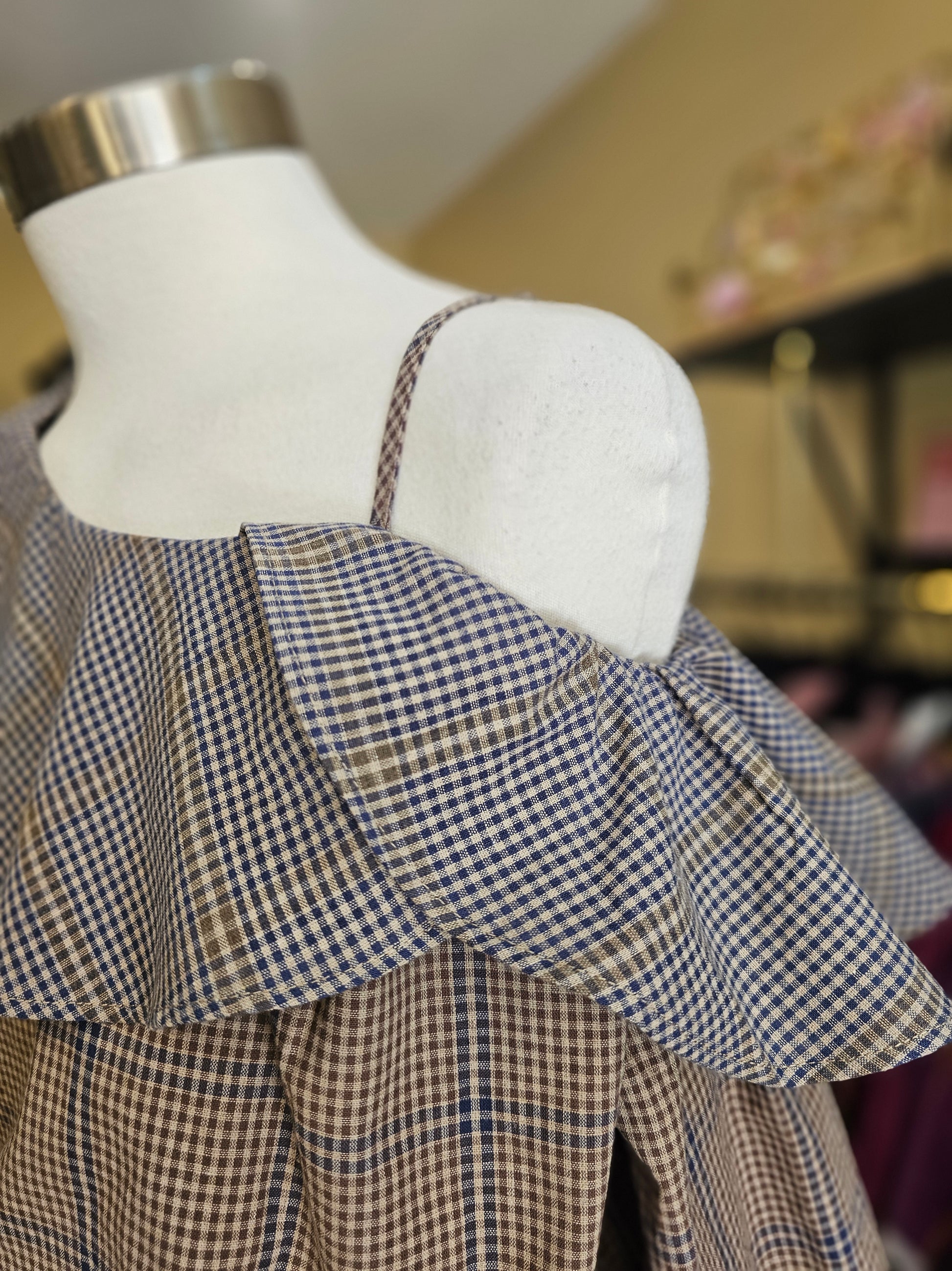 Top dénudé sur l'épaule, carreaux bleus et taupe