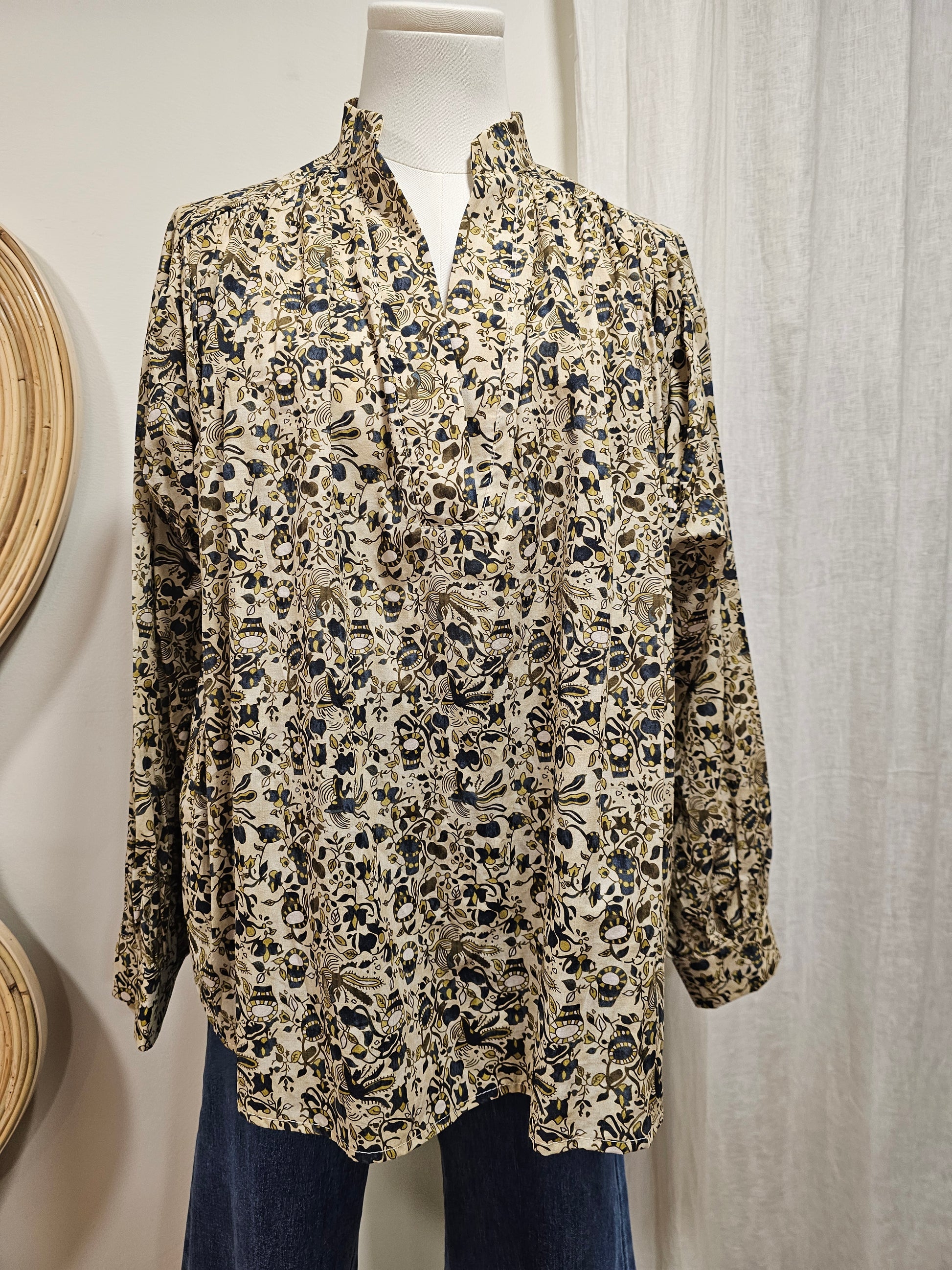 Blouse fluide en coton écru imprimé bleu nuit, kaki avec col montant ouvert, plis sur le devant et manches longues légèrement bouffantes. Coupe ample et légère, facile à porter avec un jean ou un pantalon plus habillé.
