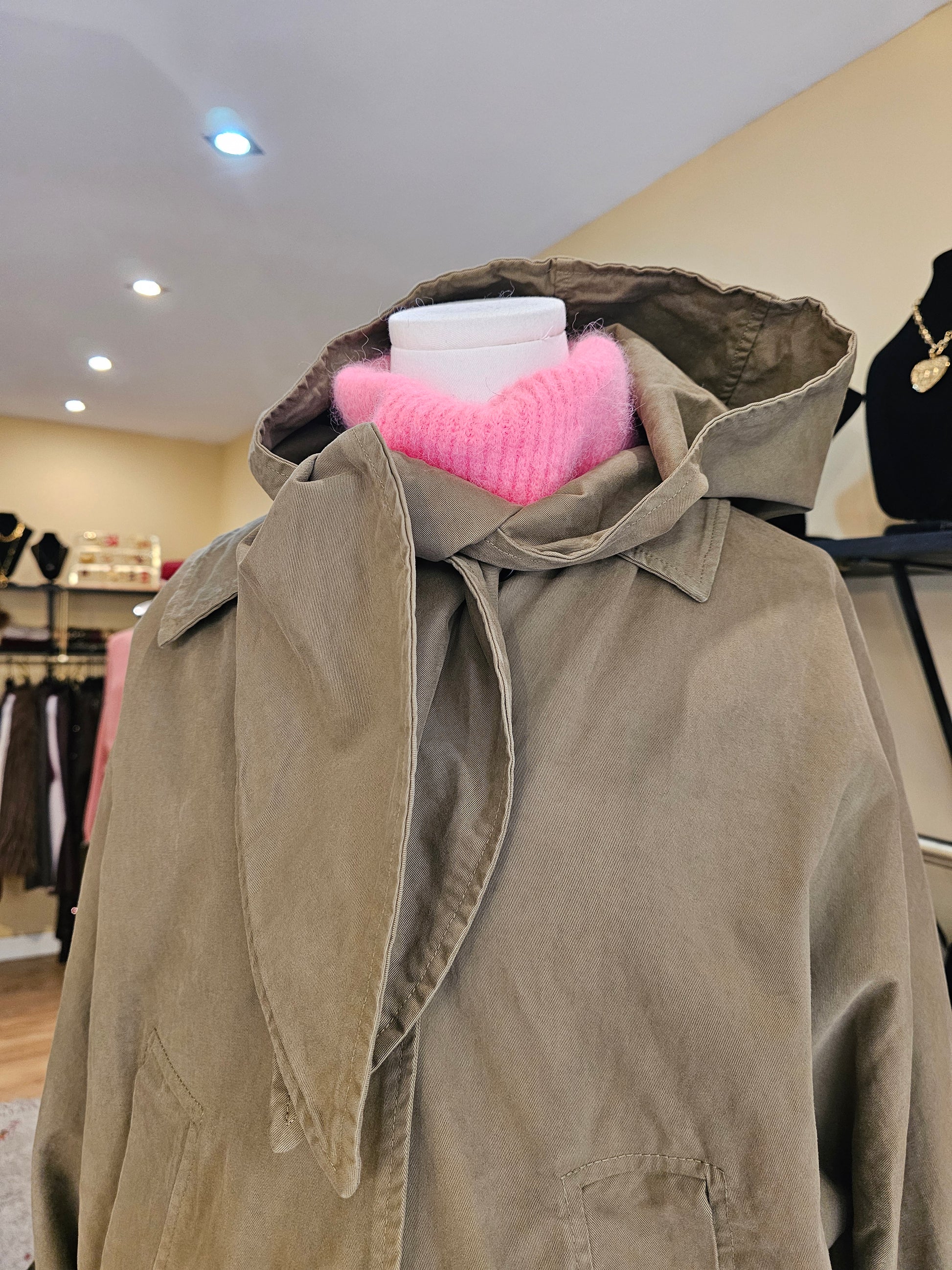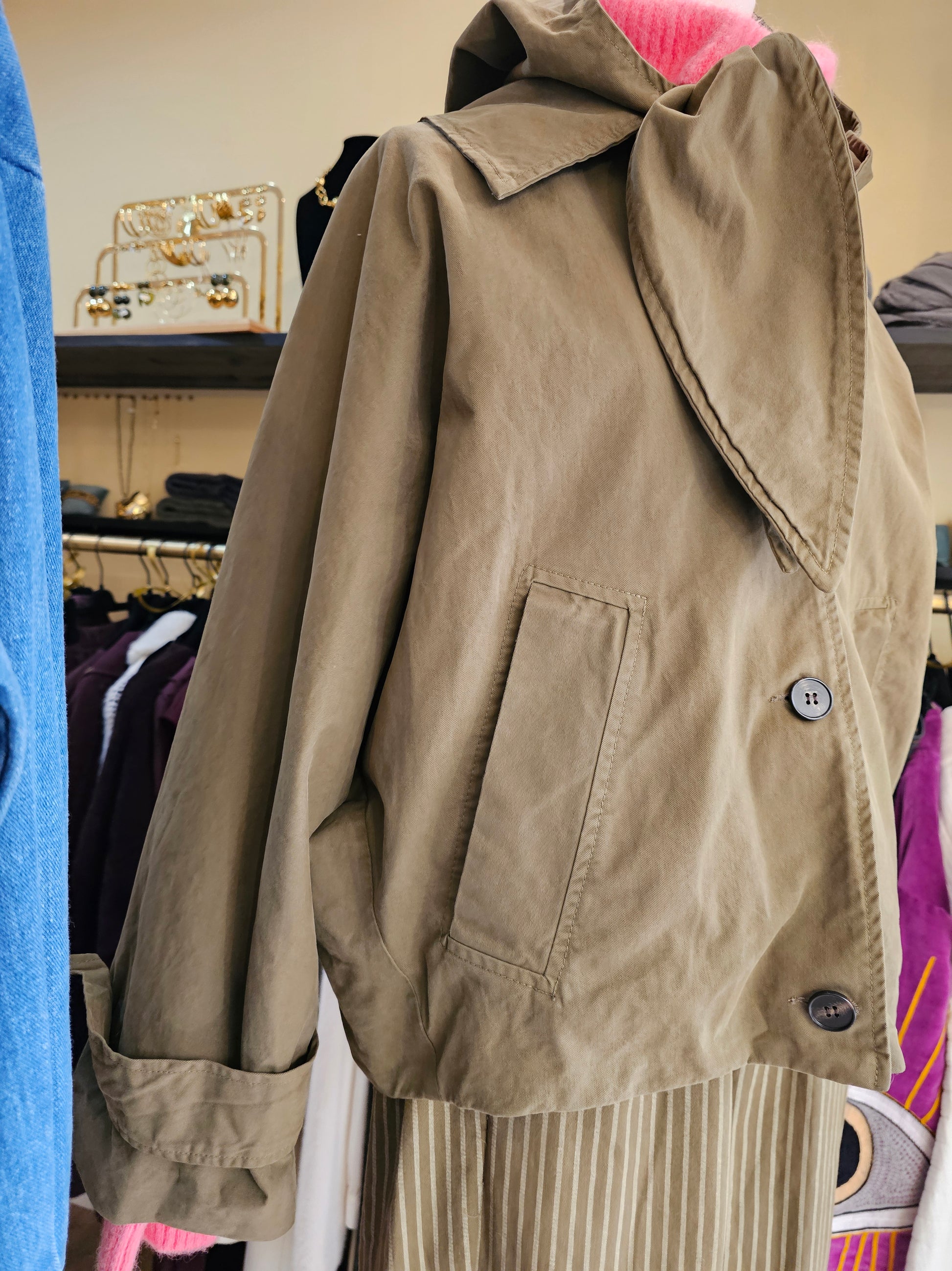 Veste en toile. Coupe droite. Col montant. Capuche amovible. Fermeture boutonnée. Poches plaquées. Manches longues.