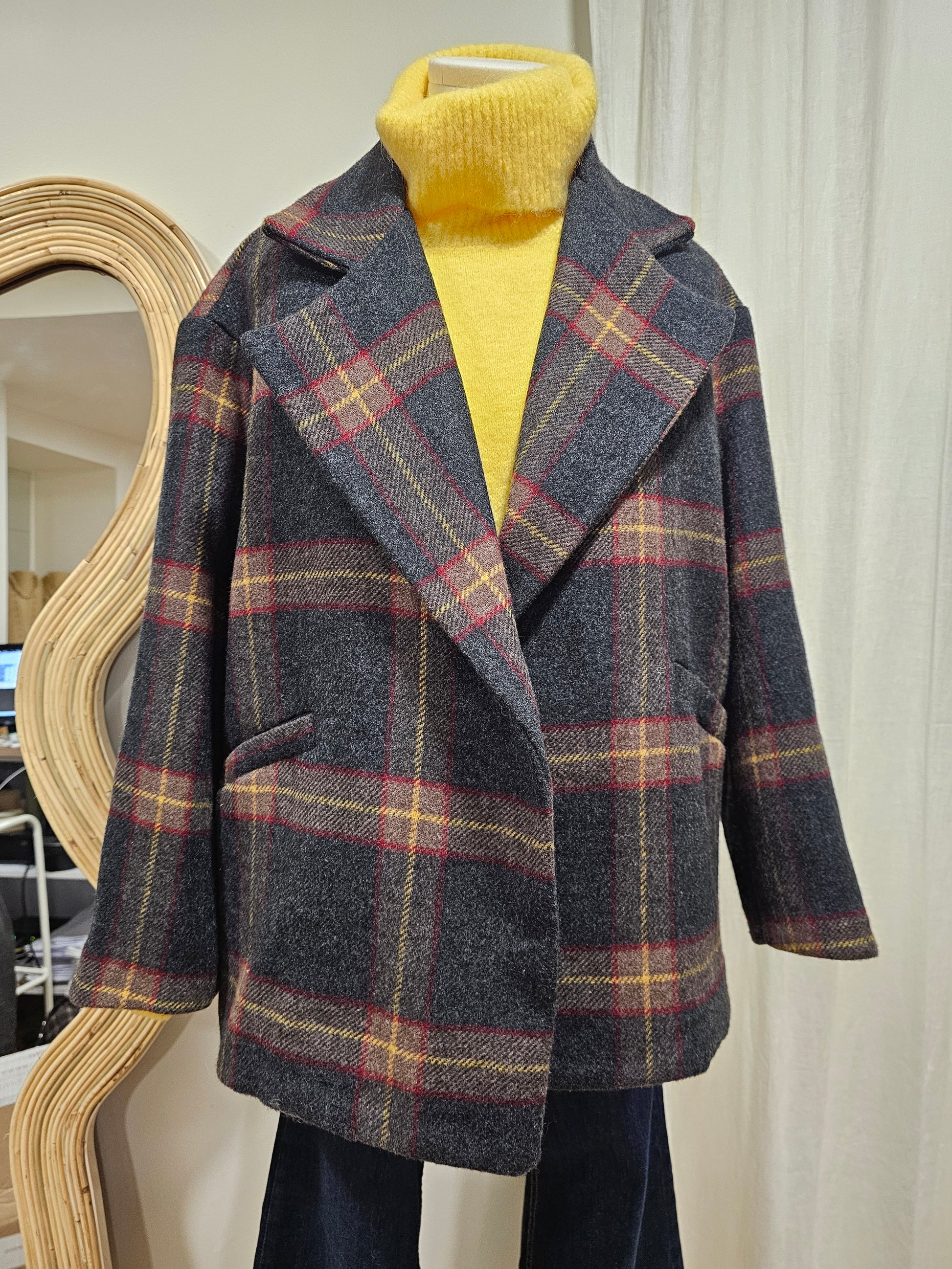 Un manteau à carreaux gris avec touches de jaune et bordeaux, coupe droite et col tailleur pour une allure chaude et structurée.