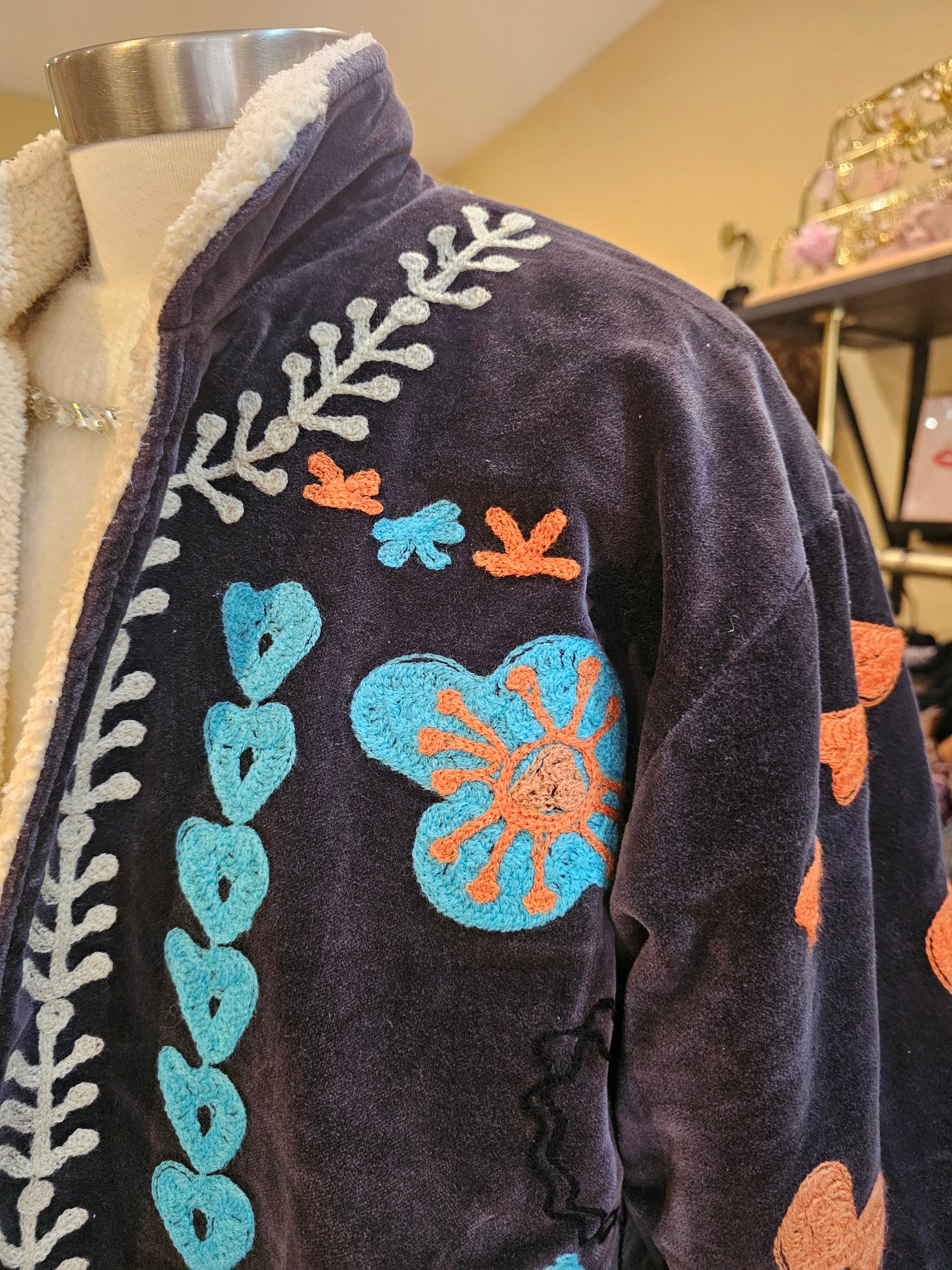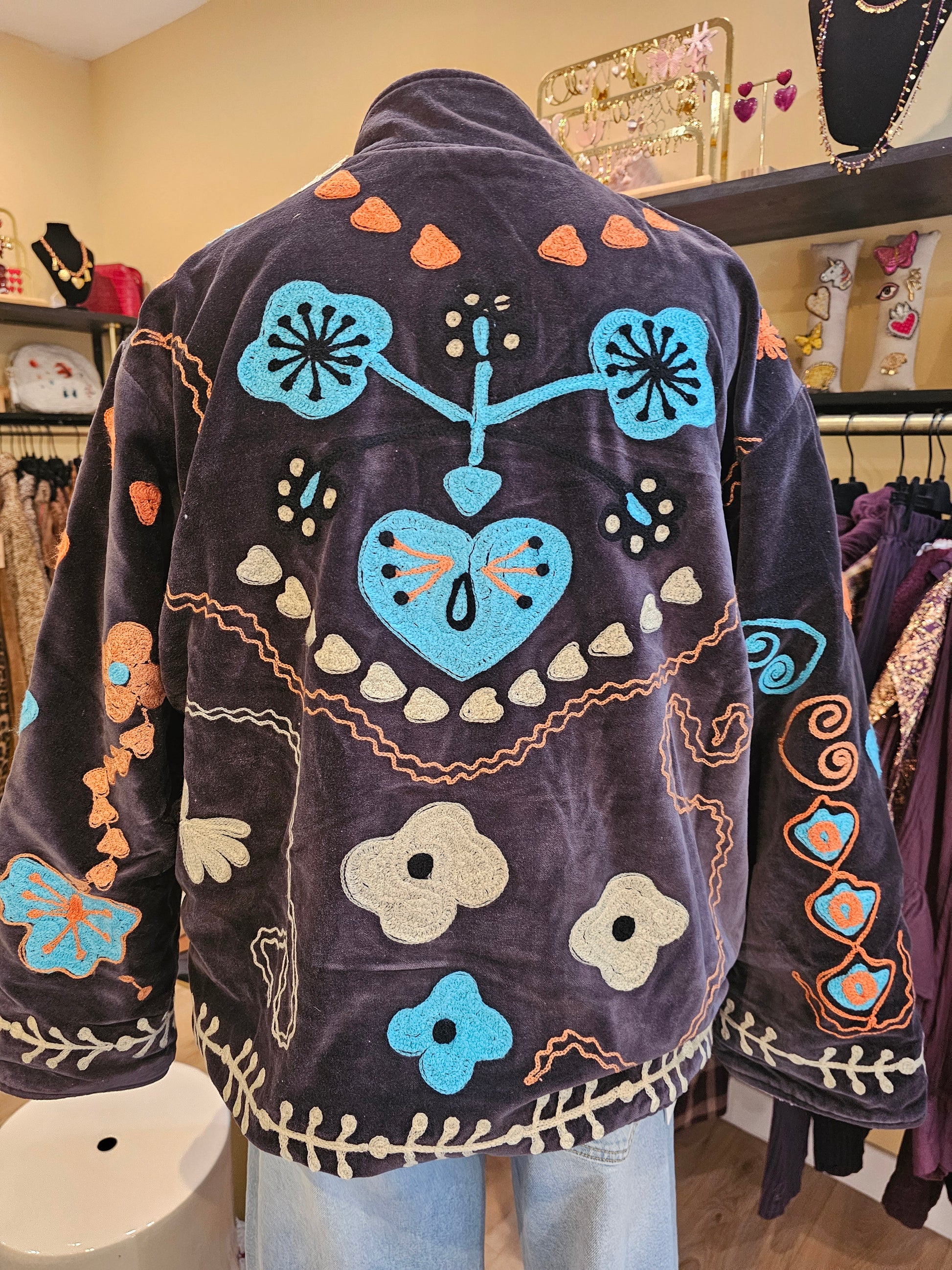 Veste en velours gris noir brodée de motifs floraux et cœurs dans des tons bleu ciel, écru et brique.