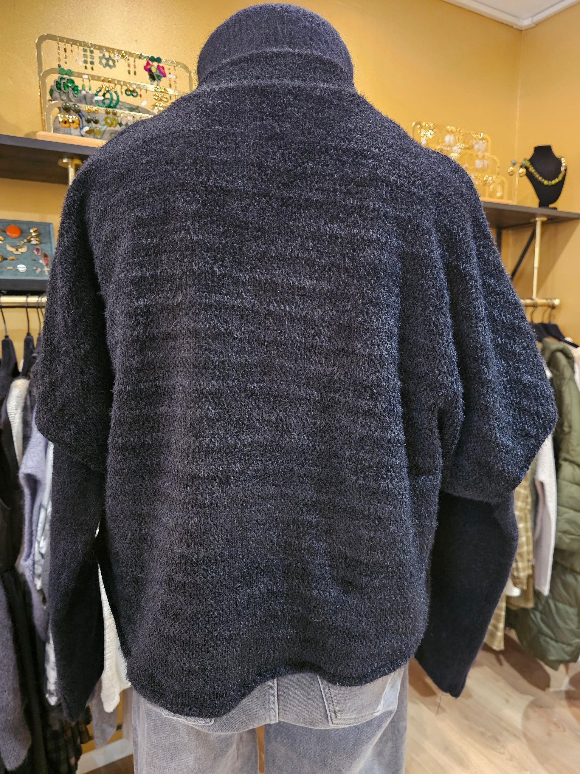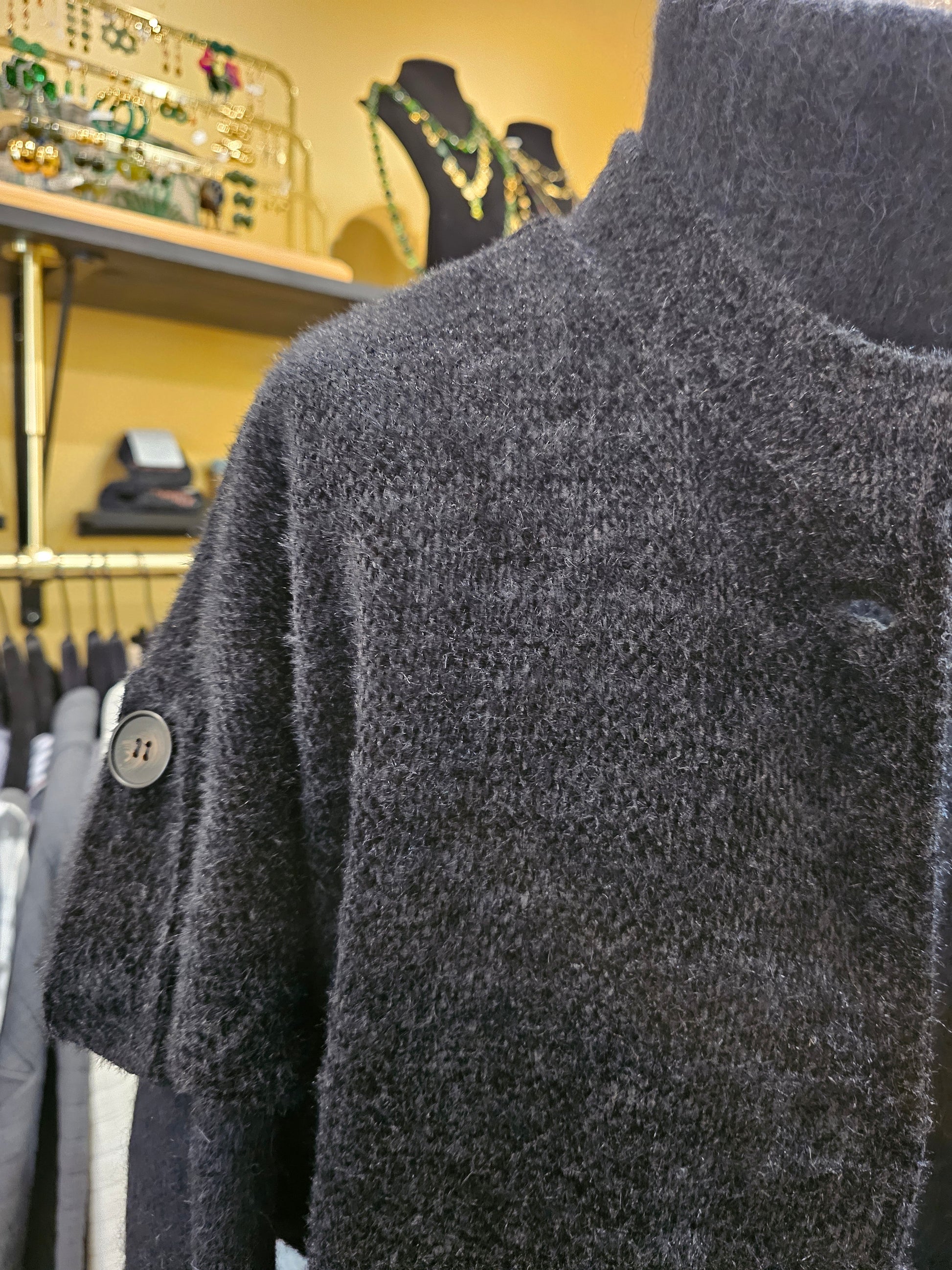 Une veste en maille noire, douce et texturée, avec manches courtes boutonnées et coupe ample. Parfaite en superposition sur un pull ou une chemise.